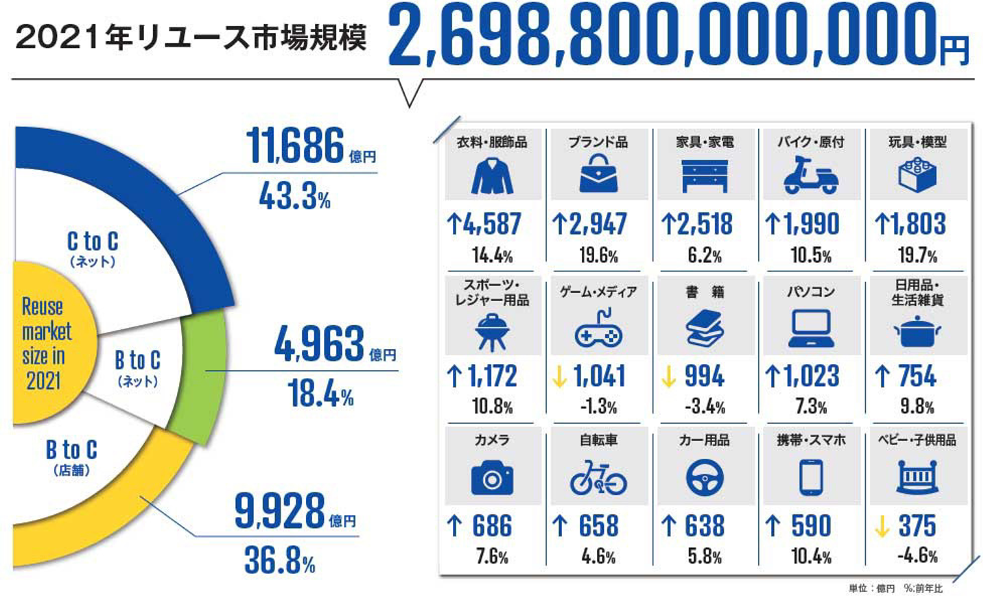 全体の市場規模である2.7兆円を1商品の平均単価が10,000円と推測すると、なんと年間約2億7,000万点のリユース品が売買されていると推測されます。