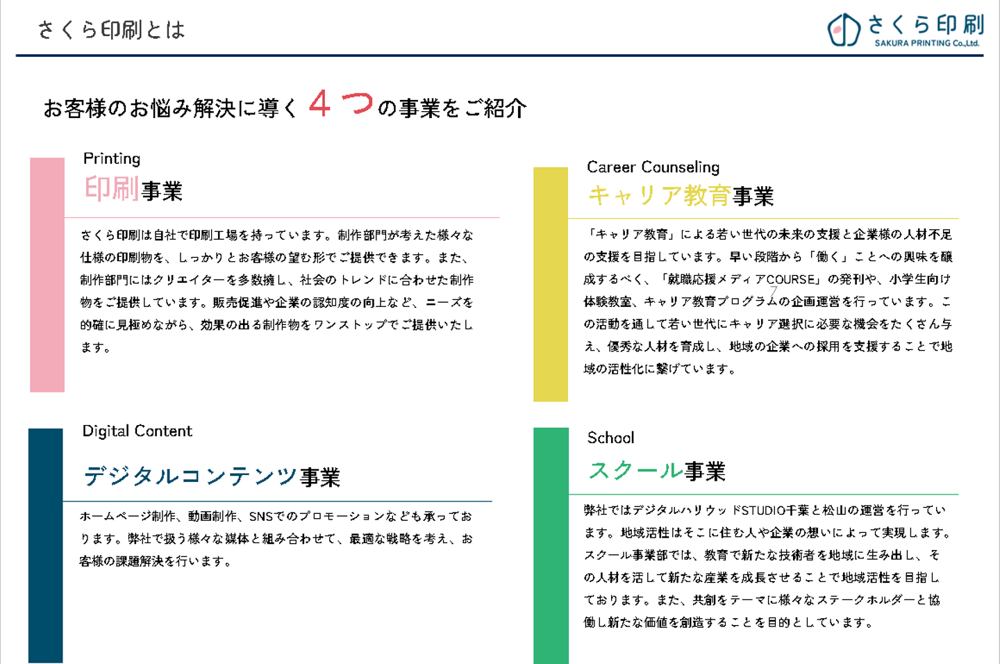 事業内容としては主軸の印刷事業を中心に、デジタルコンテンツ事業、キャリア教育事業、それからウェブデザイナーを育成するスクール事業の4つの事業を行っています。