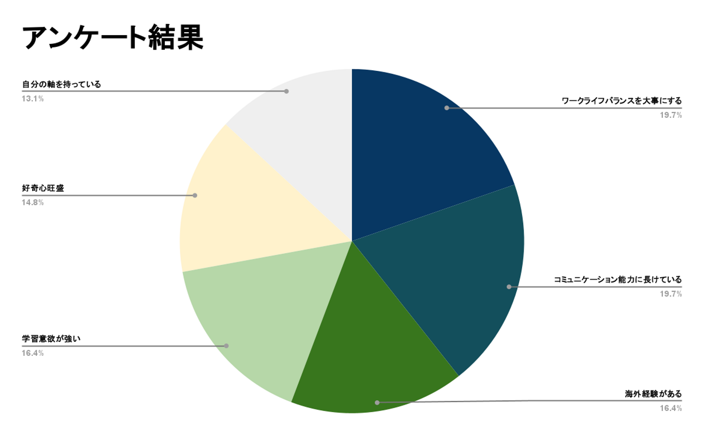 海外経験があったり、自分の軸を持っているという回答から、グローバル志向で、今後のキャリアを考えていらっしゃる方が多そうですね!