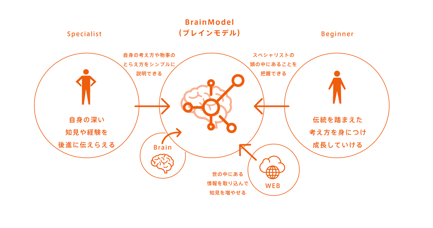 まず、ORGENIUS(オルジニアス)とは各分野における、熟達者の技能・知見を紡ぐAIです。言葉でAIを創る「BrainModel(ブレインモデル)」の技術がベースとなっているのですが、熟達者たちの複雑な思考を言語化していく中で「言葉と言葉の繋がり」を可視化し、私たちに何かあった時の「答え」ではなく「気づきや閃めき」を与えてくれるプラットフォームになっています。(詳しくは乙部の記事でご覧ください。)