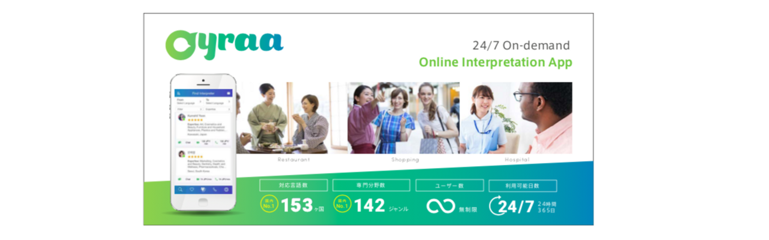 Oyraa(オイラ)は、言語の壁に悩む個人や企業と、プロ通訳者や語学力を活かしたい人をマッチングさせる、オンデマンド遠隔通訳プラットフォームです。 We are a Tokyo-based startup, making on-demand interpretation more reachable and affordable to not only businesses, but also individual users all around the world, 24/7.