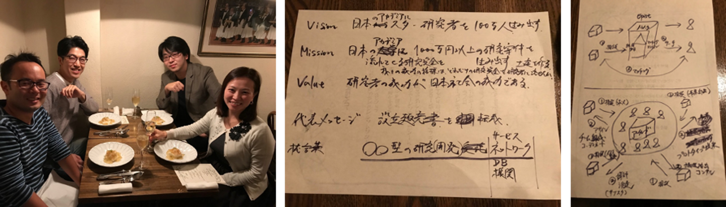 さらに、ビジネス分野のエキスパートが必要だなと感じた僕は、友人の三好君と鶴君というシリアルアントレプレナーの二人を口説くことにしました。二人とも二桁の数の会社を学生時代から起業し、成功に導いてきた百戦錬磨の起業家です。麻布十番で飲みながら、どうやら二人とも「一緒にやろう!」と快諾してくれたようでした。