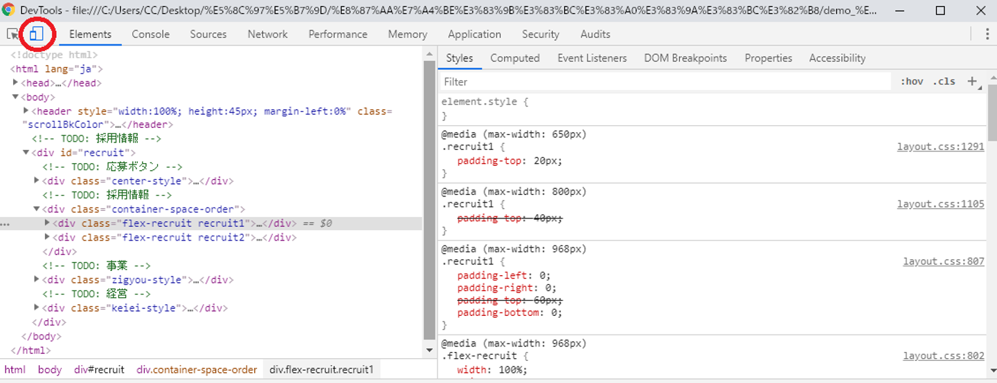 以上の方法で、ひたすらにサイズを変えては確認、変えては確認という作業を行っていきます。画面が小さくなった際に、全体のバランスを保つのがなかなかに難しく苦労しました。「最初からレスポンシブを考えて作っていれば」と思いながら作業を続け、無事に調整は終わり、ホームページ作成完了しました。