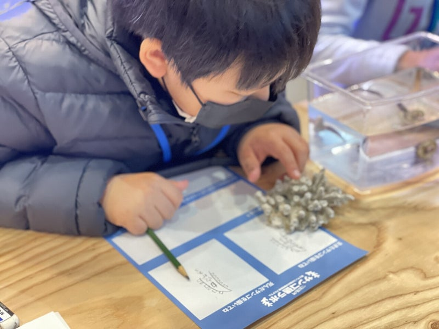 みんなにはおなじみの死んだサンゴと生きているサンゴを比較してもらって気がついたことをメモしてもらいます。