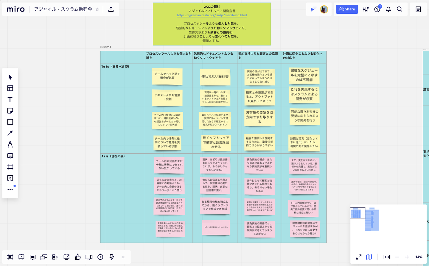 みどりクラウド事業部で開催しているアジャイル・スクラム勉強会でも、ワークショップではMiroを使用しています。TeamsのWhiteboardと比べると、トラックパッドでズームの操作がしやすいのと、付箋の大きさを変えやすいのが気に入っています。