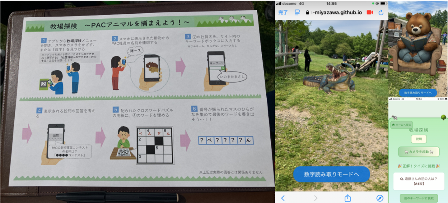 広~い牧場内にある問題を解いてクロスワードパズルを完成させるこのアクテビティ。スマホをかざすとあら不思議!動物たちが現れるのでその動物の名前が入っている社員のフルネームを答えるとクイズがもらえて…という、知能と行動力が求められる高度な遊びです。