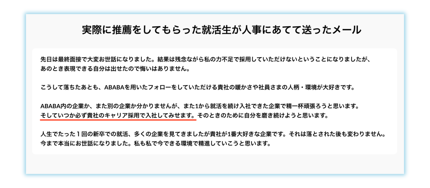 そうしたカルチャーを一緒に作っていけば、最終面接までのプロセスと実績が公正に評価されるようになり「引き続き頑張ってください」と学生の就活を応援する世の中になっていくと思います。ABABAを利用することで関わる人の人生が豊かになるそんなサービスにしていきたいです。