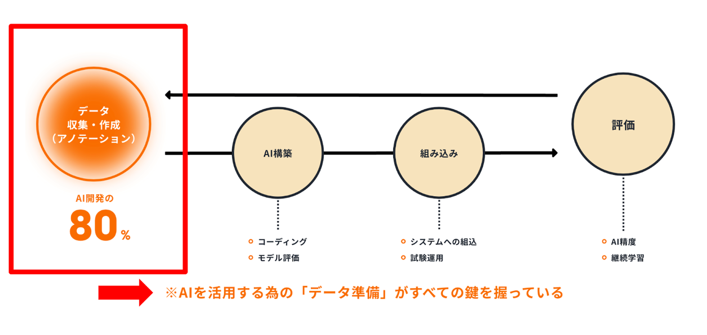 AI開発においてカギとなるのが、精度の高いアノテーション(データ収集・作成)と言われており、実はAI開発に必要な工程の80%は、この「アノテーション作業」となっています。
