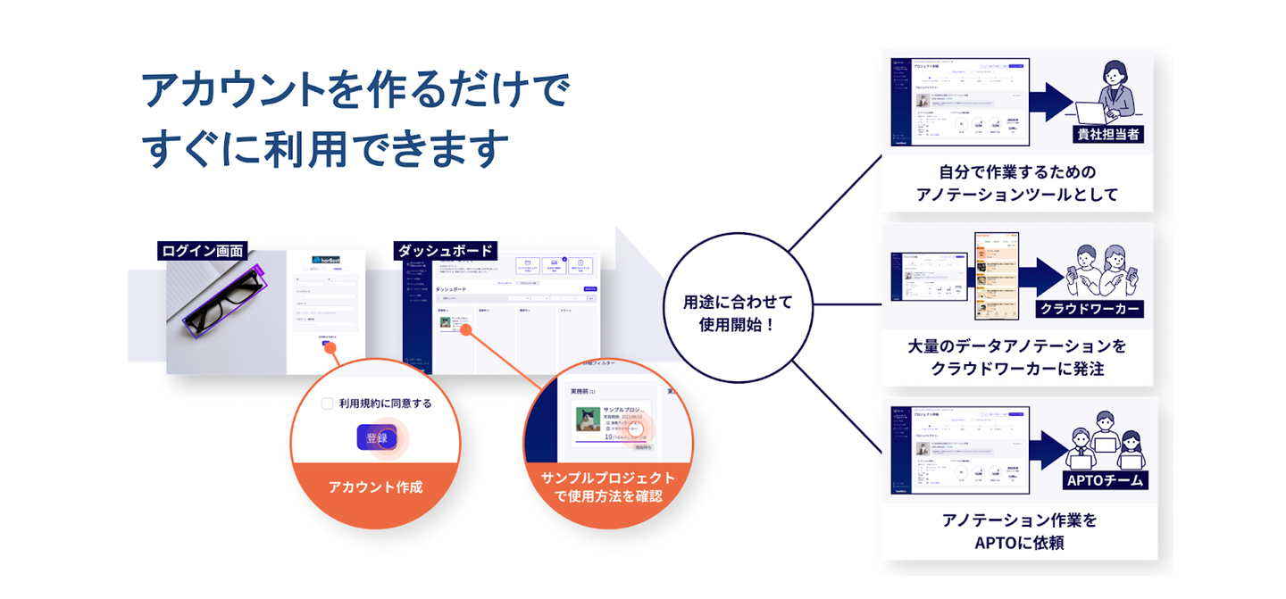 例えば「この領域に特化したAI開発がしたい」となると、AI開発エンジニアはまず、元になるデータをどう集めるかを考えなけれなりません。データ収集・作成に特化すれば、AIの専門家でなくても対応できるはず。AI開発エンジニアの方々には「エンジニアにしかできない分野」に集中していただき、生産性を高める方がコストを抑え・高性能なAI開発が実現できるのではないか──APTOはそう考え、誰もがアノテーションを行えるプラットフォーム「harBest」を通じて、この社会課題に取り組もうとしています。