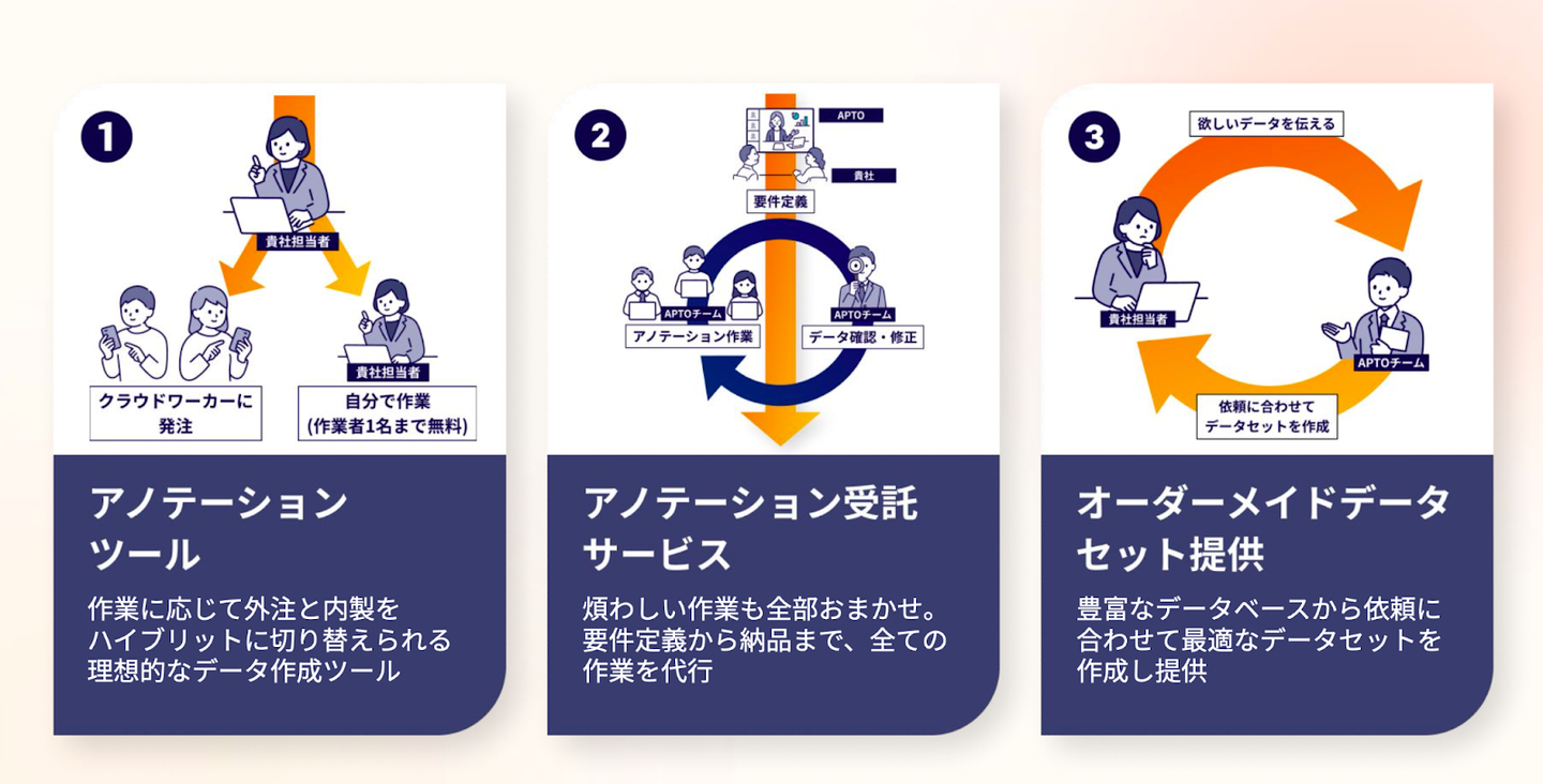 クラウドワーカーではなく、APTOが要件定義からデータ収集・作成・納品まですべてを代行。データ収集のマニュアル作成や、データ内容のチェックなども担当します。よりスピードやクオリティを求められる企業様や、珍しいデータを収集・作成したい企業様に利用いただいております。
