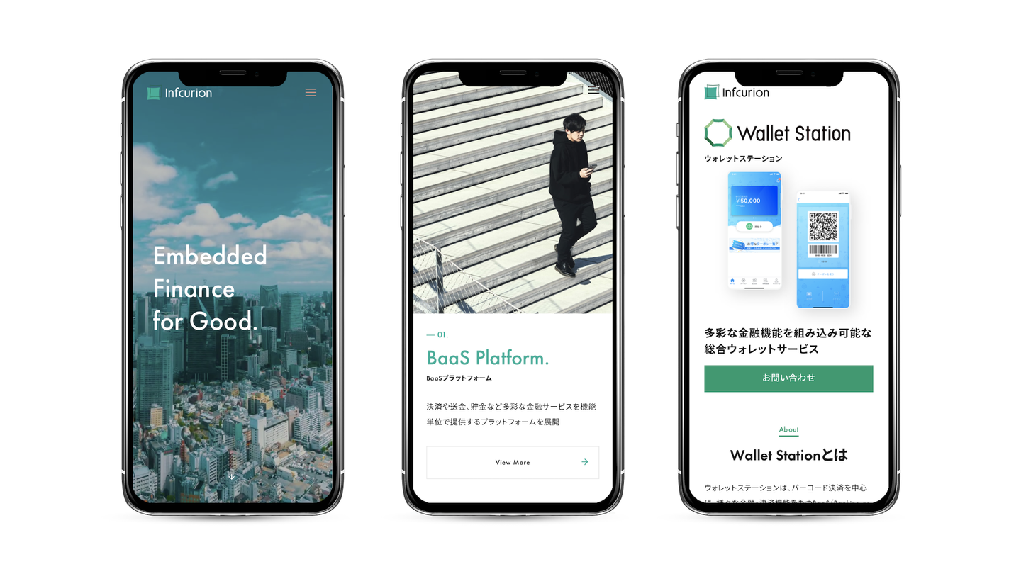 例えば<Our Business>のひとつに、決済や送金、貯金など多彩な金融サービスを提供するプラットフォーム<BaaS Platform (バースプラットフォーム)>というものがありますが、B to B では理解できても、B to C やリクルート目的で訪問したユーザーにとってはすぐに理解しにくいかもしれない。そういった理由からサービスとして伝わりやすい自社サービスである<Wallet Station><Xard (エクサード)><Paydash>という3つはトップページに配置するよう提案したりと、あらゆるユーザーにとって「インフキュリオン社とは?」をひと目で把握できるようなものにしました。