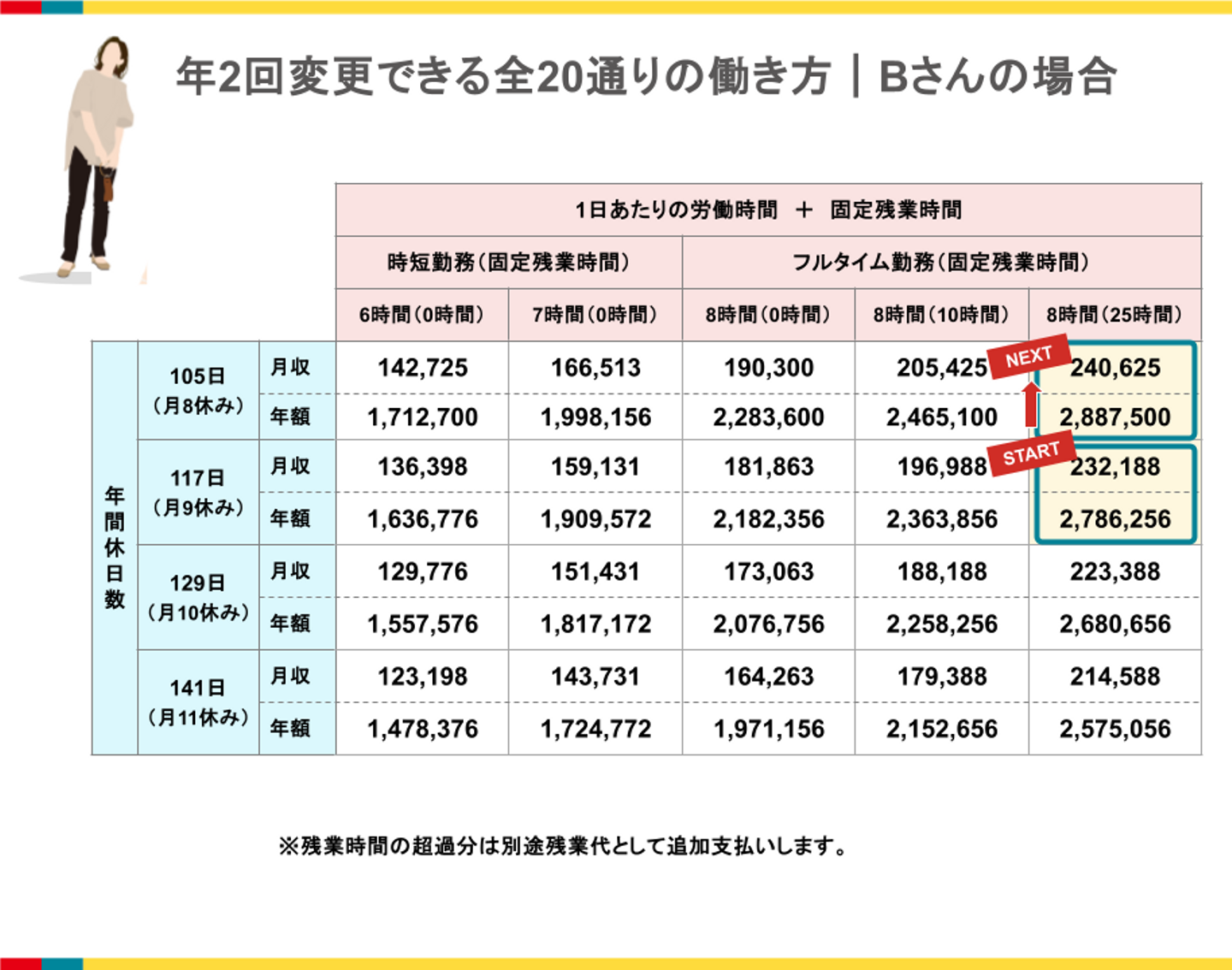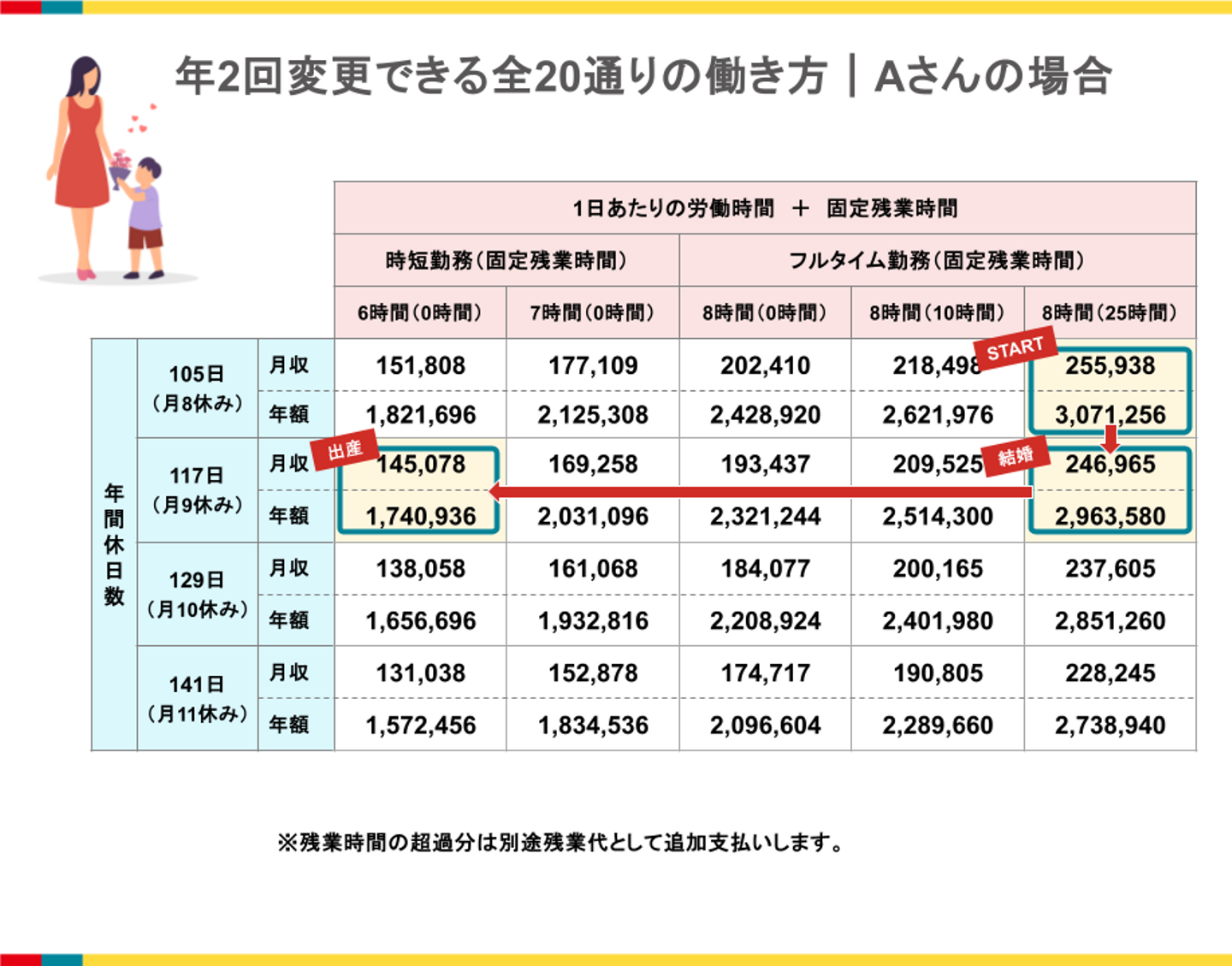 社内には結婚や出産を機に固定残業時間をゼロにしたり、休日数増やしたりして、ワークライフバランスをとる社員が少なくありません。Aさんも、だんだんと働きやすさ重視のスタイルにシフトしています。