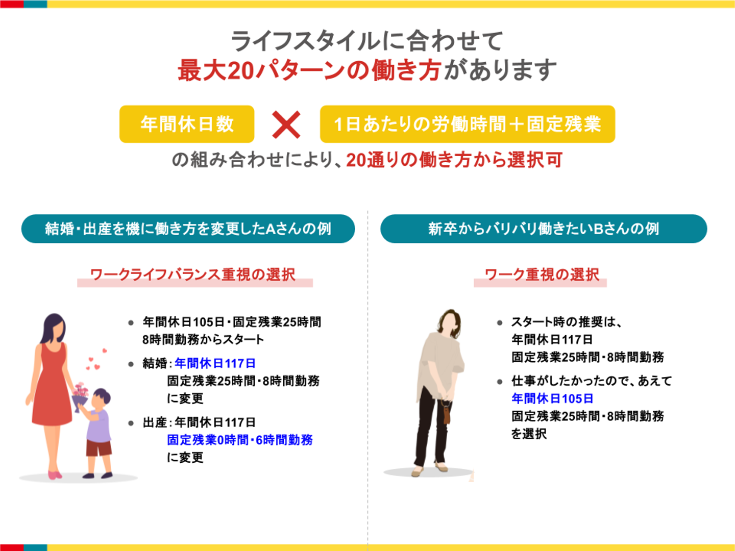 入社時にはこのうち「残業タイプ」と「休日タイプ」を自由に変更可能。ライフスタイルに合わせて自分らしく仕事に取り組めます。