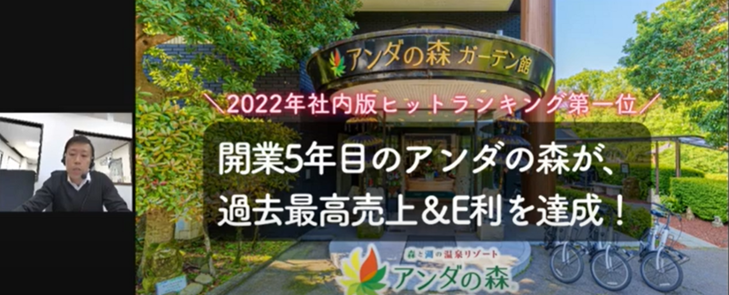 さて、昨年末12月度オンライン全社員会議では「NSグループヒットランキング2022」を発表しました。今回1位を受賞したのは、伊豆事業部の「家族と楽しむ温泉リゾート アンダの森」です!
