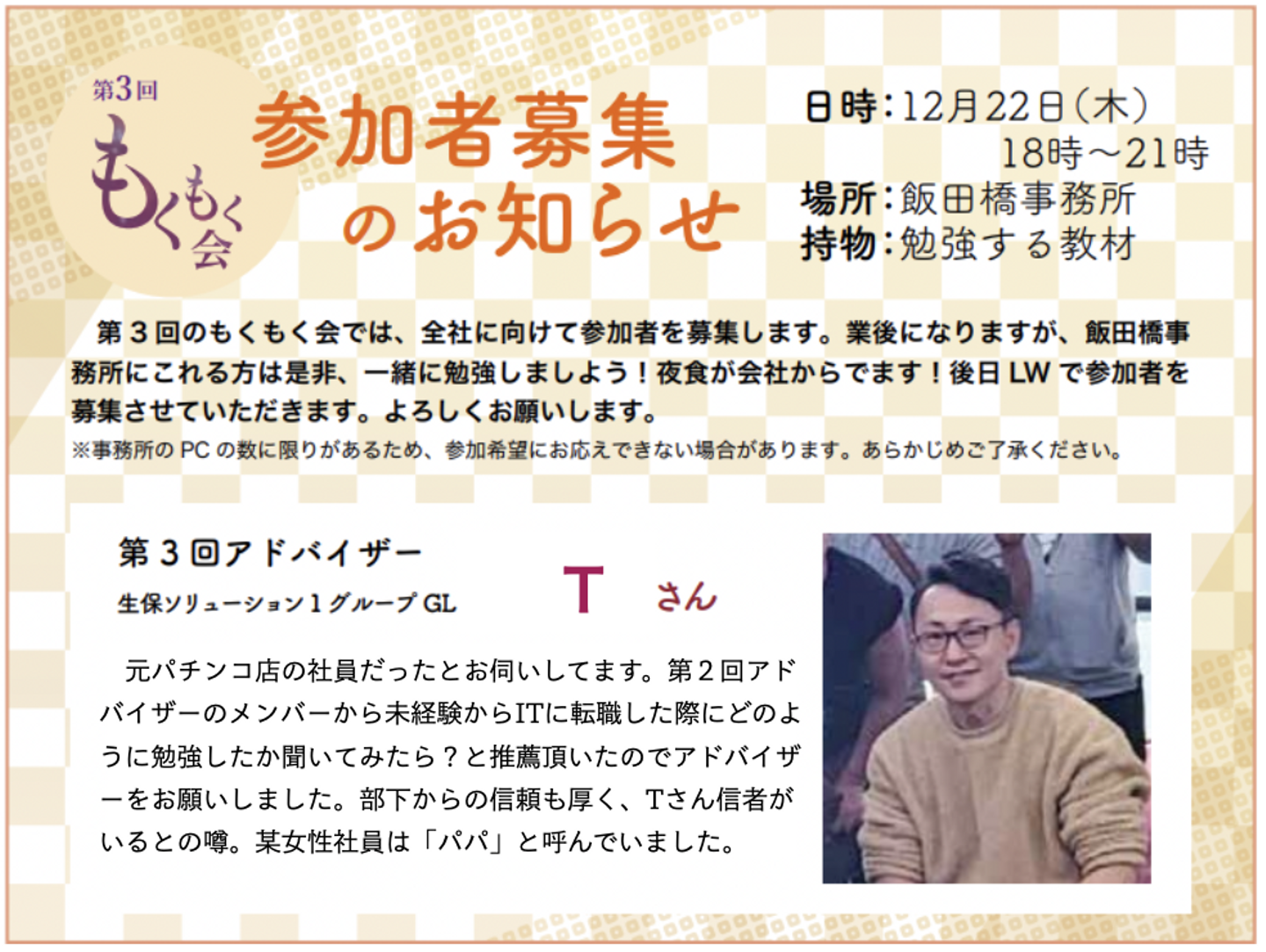 今回は、テトラ初開催の「もくもく会」を企画してくれた鎌田さんのインタビューを中心に