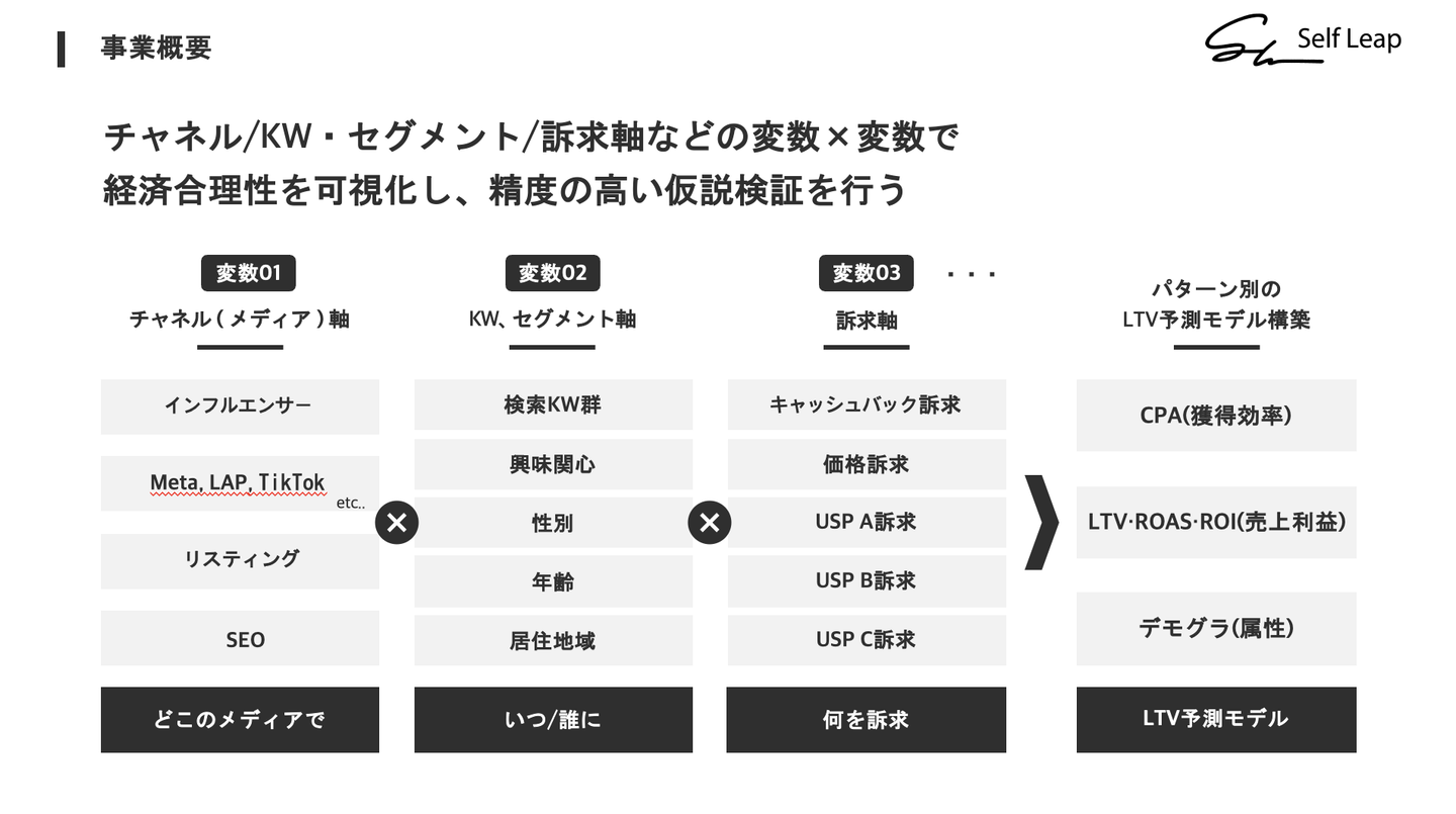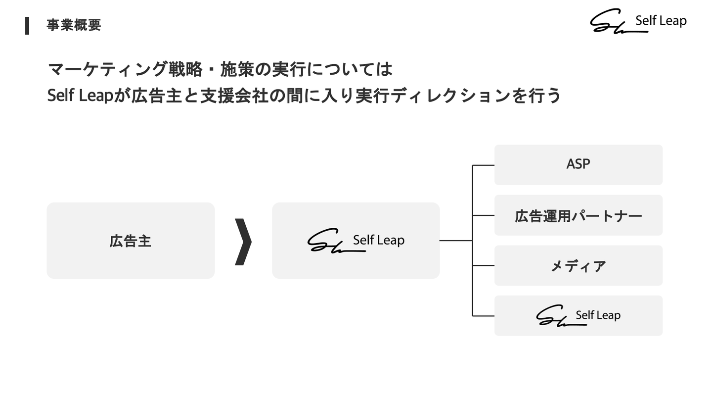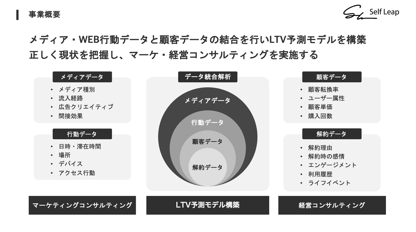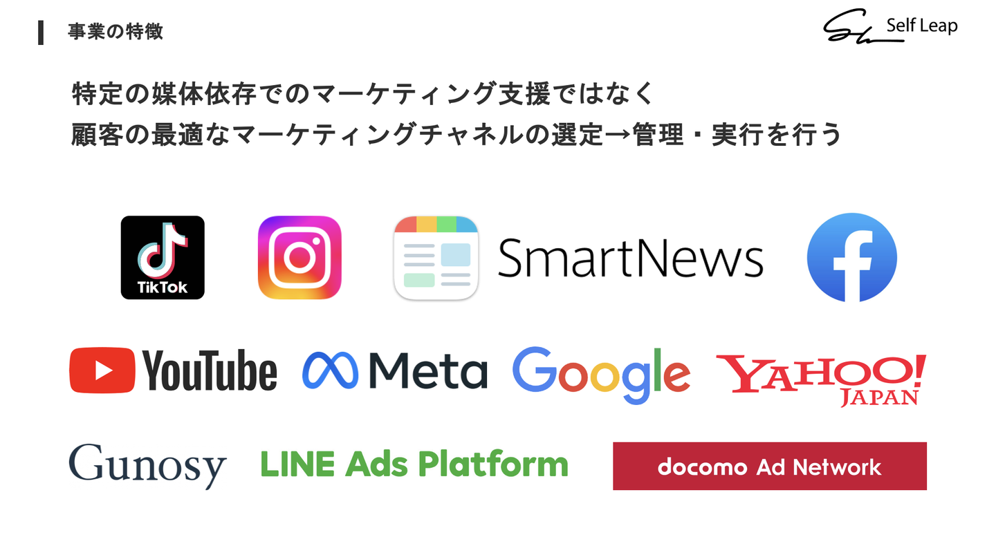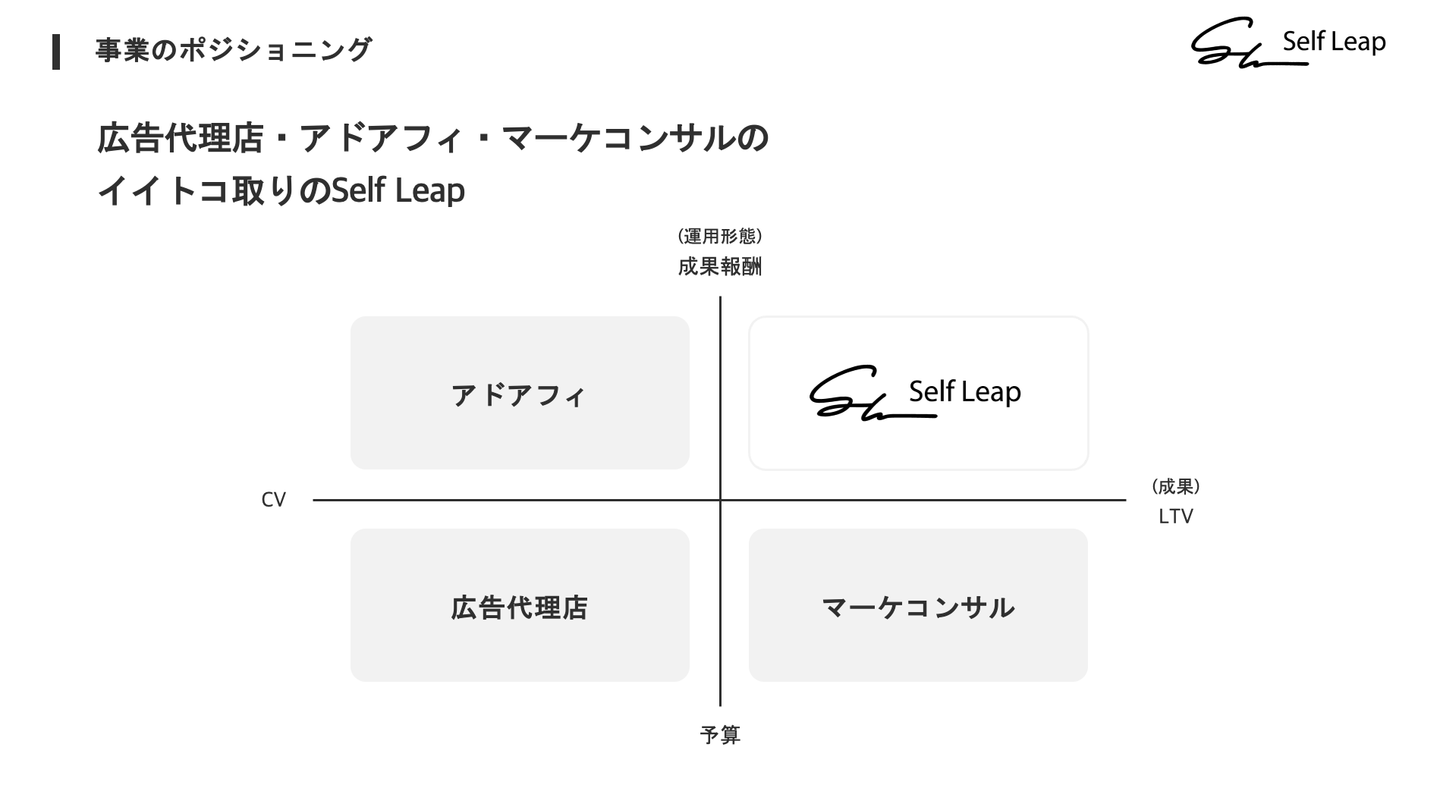 株式会社Self Leapは、企業のLTVやROAS、ROIなどの改善に特化したマーケティング支援を展開しているマーケコンサルベンチャーです。