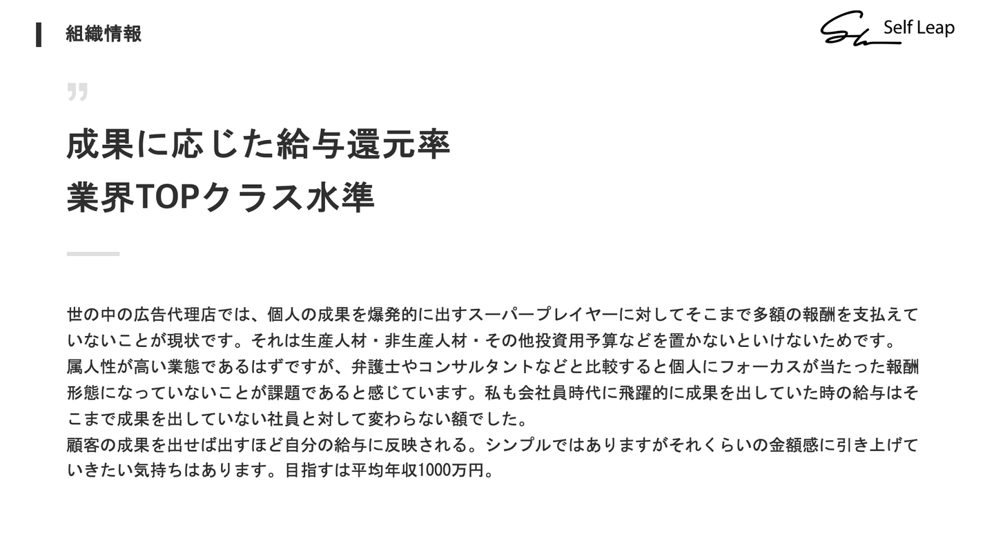 >>ではその広告運用経験者の方向けに色々と聞かせてください。ずばり広告運用経験者がSelf Leapで得られるものとは一体なんでしょうか?