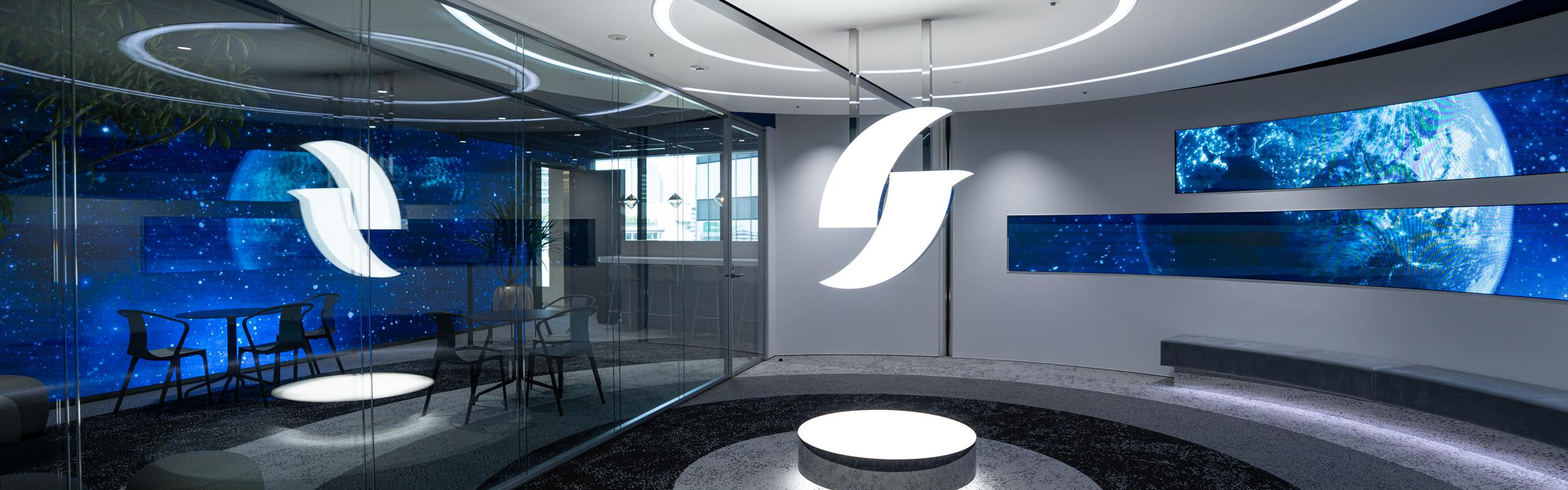 アイデアが自由に飛び交い、チームのつながりが深まる、まるで宇宙空間のような開放感にあふれた空間です。