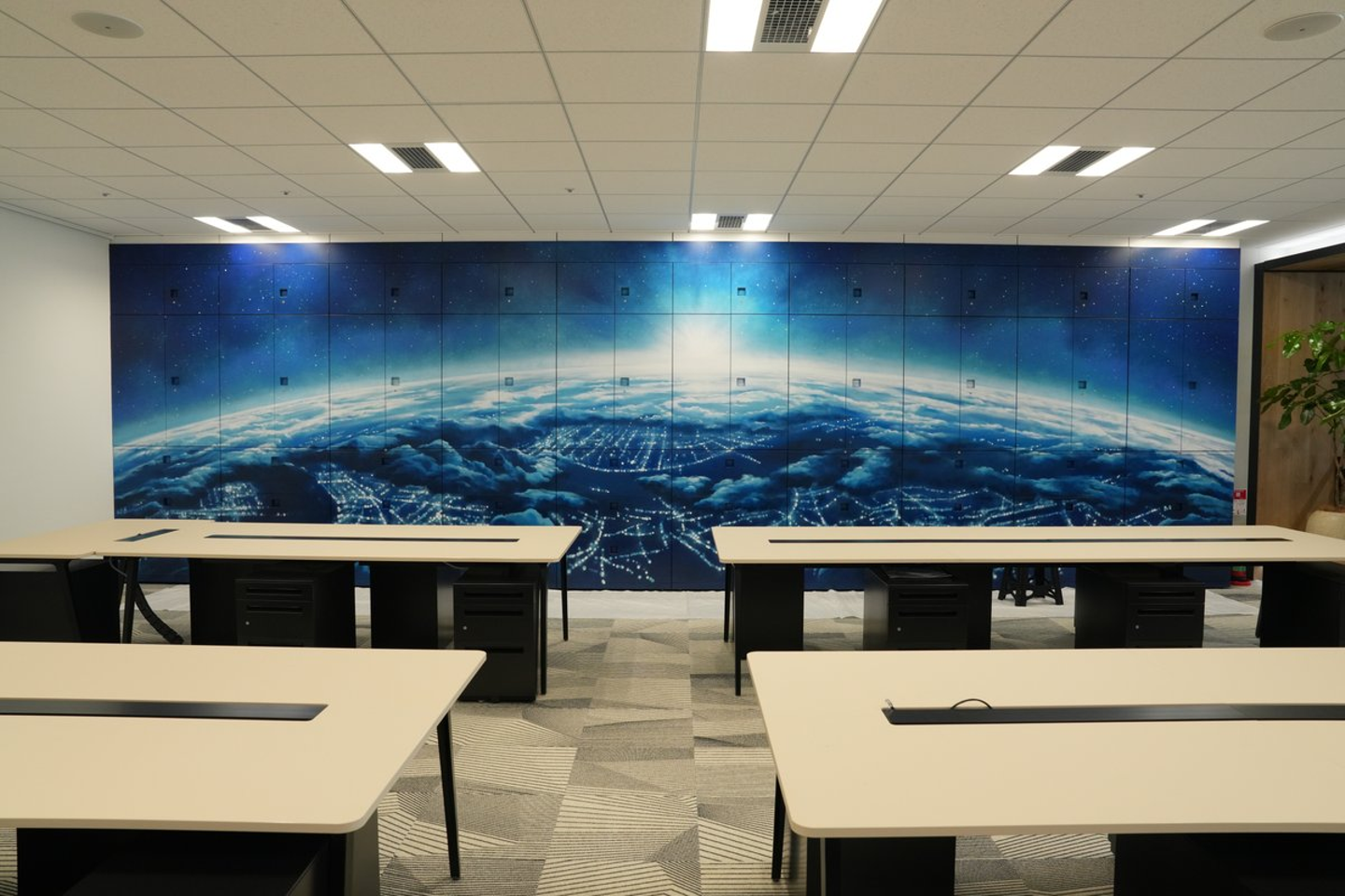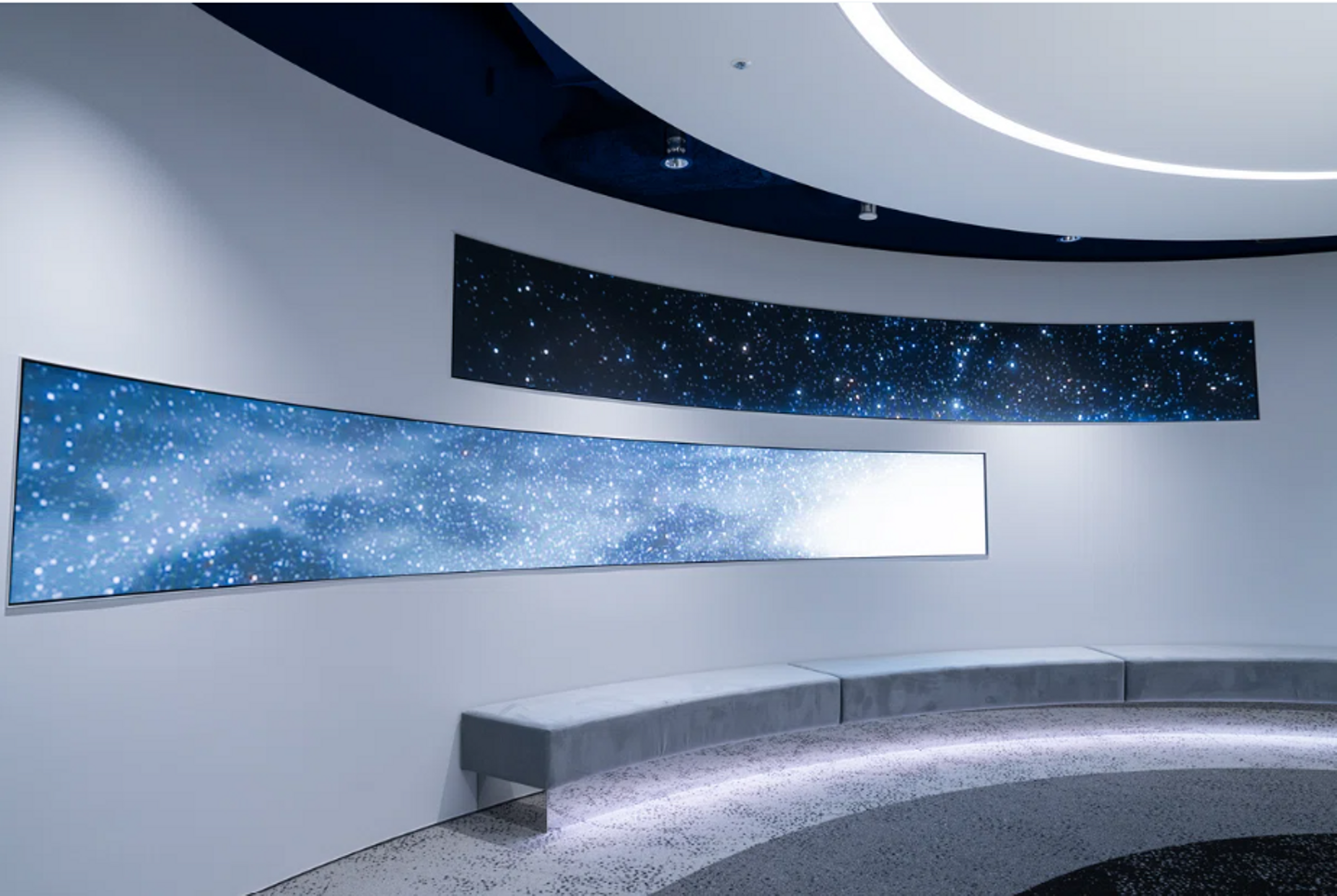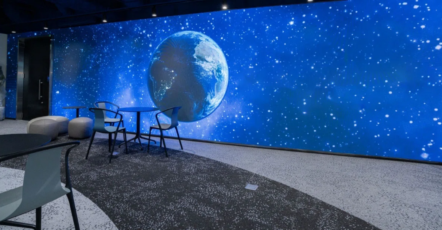 多目的に活用可能な超大型スクリーンには、地球の映像が映し出され、スケールの大きさを感じさせる空間を演出しています。