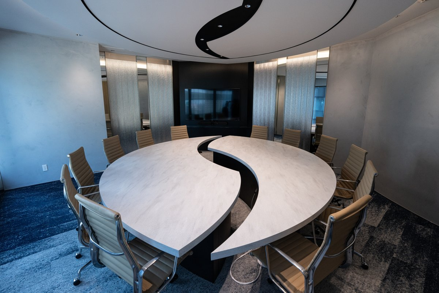 「この部屋での商談はすべて良いものになる」——代表の強い想いを体現した会議室。ロゴをかたどった特注テーブルが空間の象徴です。大人数での会議にも対応できる、こだわりの詰まった会議室です。