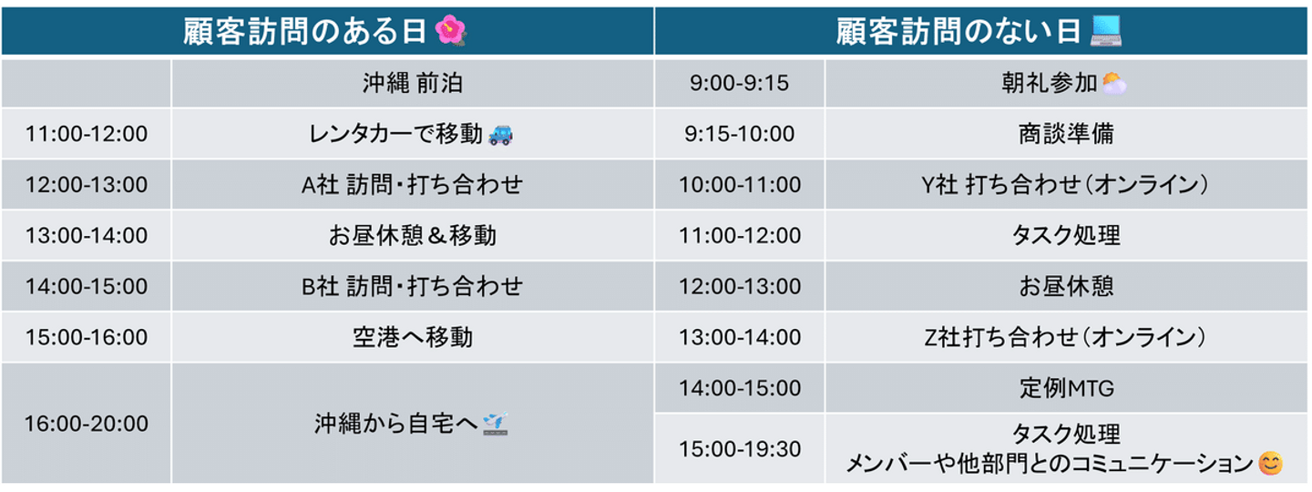 顧客の訪問有無でかなり変わるのと、個人差があるのであくまでも一例ですがこんな感じです☟