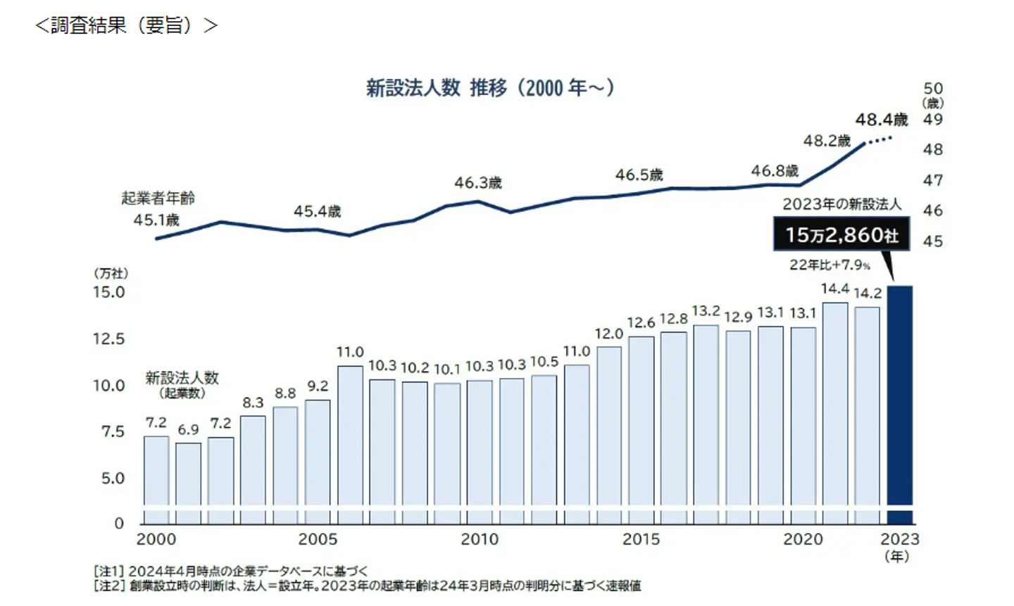 起業の手続き自体は簡単なものになってきています。実際に数字としても表れてきており、帝国データバンクの調査によると、2023年に日本全国で新設された企業は15万2860社と言われています。2000年における新設企業数は7.2万社と言われており、この20数年で1年あたりに生まれる企業の数が倍に増えたことが分かります。
