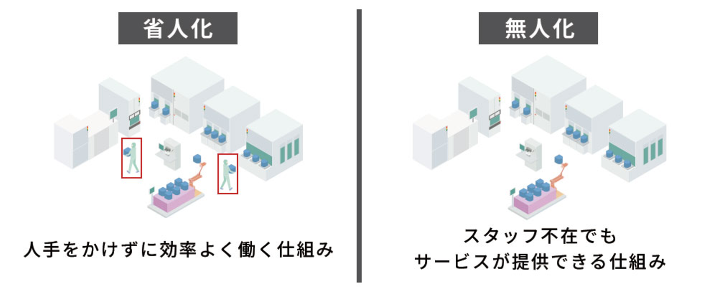一方で、無人化は、そもそも人を介さずに業務を完結させることを指します。