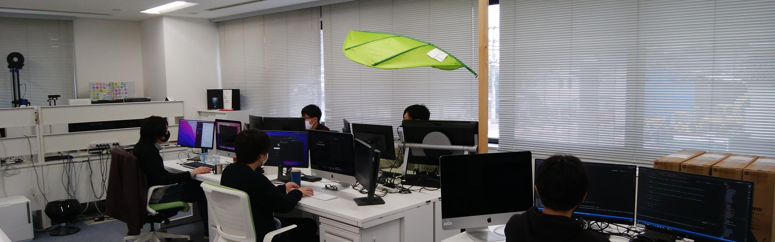 見た目はごくごく普通でオシャレでもなんでもないオフィスですが、働く環境にはこだわっています。広々デスクは幅が160cmあり、トリプルディスプレイでも余裕で乗ります。