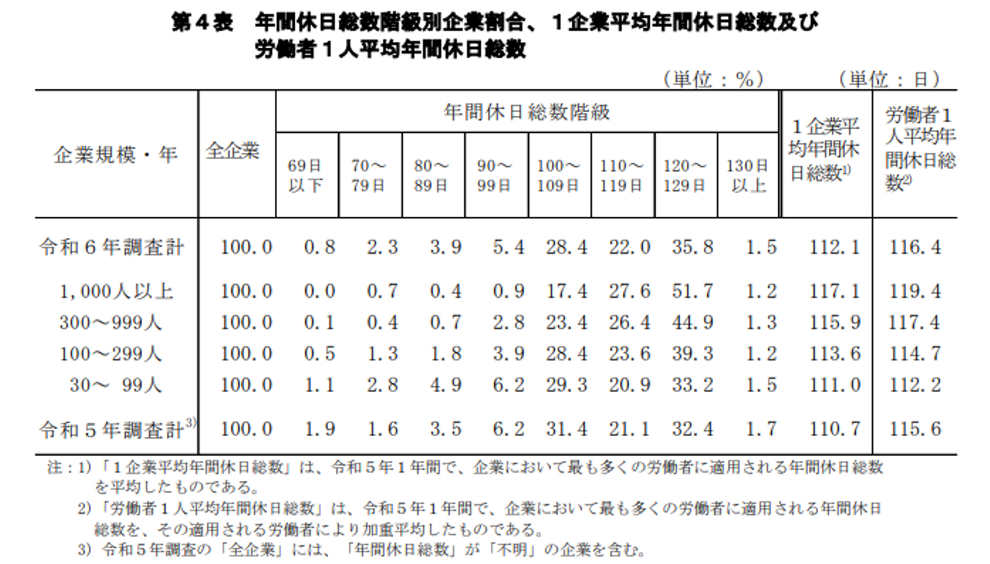 出典:令和6年就労条件総合調査の概況 7頁 第一章 労働時間制度 第三項 年間休日総数