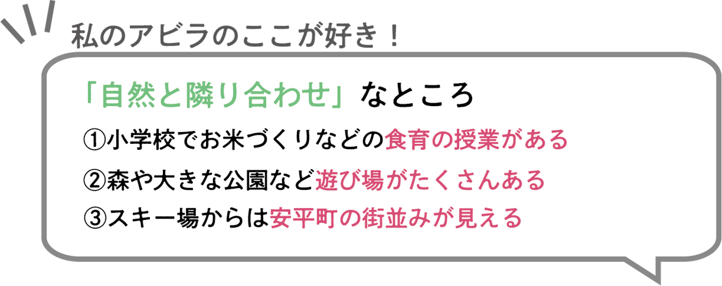 安平町で育ってきているが故に慣れてしまっているところもありますが、暮らしと自然が隣り合わせなところだと思っています。広い公園やキャンプ場、スキー場、スケートリンクなど子どもから大人まで自然に触れ合える環境が整っています。
