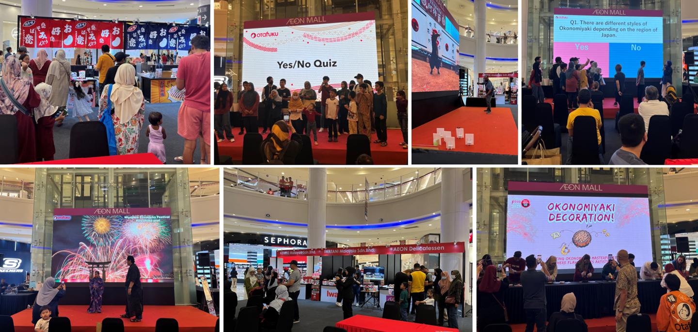 会場では、オタフクソースを使用した「お好み焼・たこ焼きの試食提供」や、協賛企業様による商品販売を実施しました。また、特設ステージでは、日本の夏祭りを感じられるような輪投げ、手裏剣体験・着物の着付けなどの日本文化体験、クイズ大会、来場者やマレーシアのインフルエンサーを招いて調理実演を行いました。