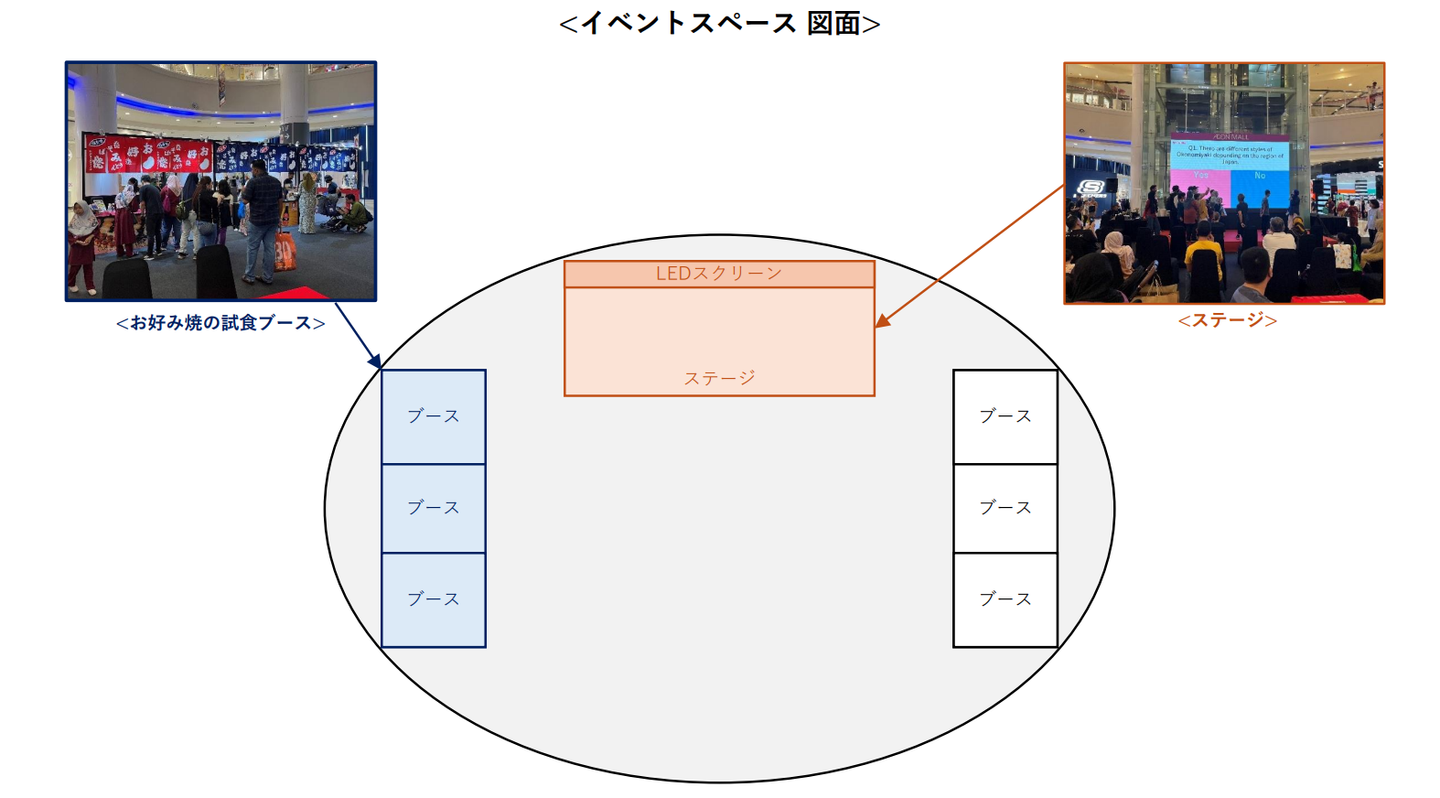 イベント当日、ステージ(下図:オレンジ)では「ステージコンテンツの実施やステージの幕間には映像放映」を行ない、ステージ近くのブース(下図:紺色)では「お好み焼きの試食」を行なっていました。
