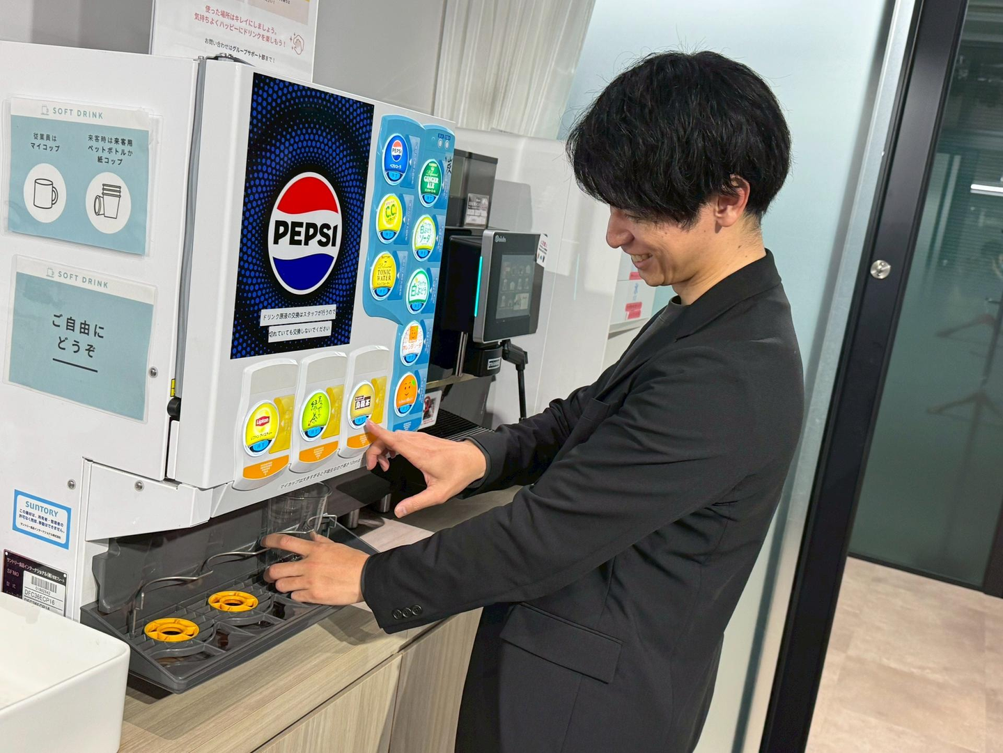 また、フリードリンクではお茶やジュースはもちろん、本格的なコーヒーやカフェラテなどのカフェドリンクも無料で好きなだけ楽しむことができ、さらに定時後にはビールやハイボールなどのアルコールの提供も行っているため、仕事終わりに部署のメンバーと軽く一杯楽しむようなプチ飲み会も定期的に開かれています☆