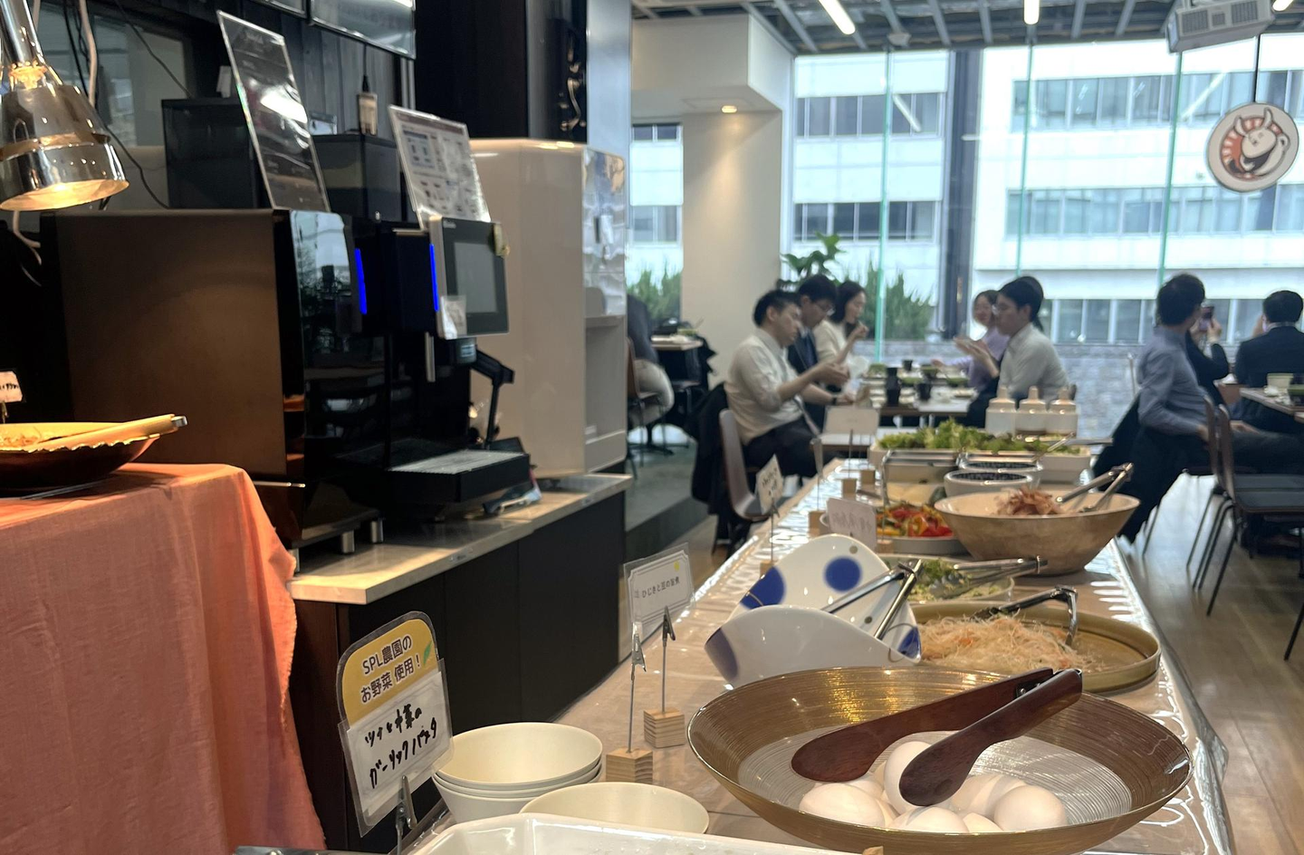 S-Pool LOUNGEは、エスプールグループの従業員であればだれでも使える福利厚生施設です。平日ランチタイムには社員食堂としてヘルシービュッフェを提供している他、夕方以降は店内を貸切って利用することができ、社内懇親会や勉強会、クライアント向けのイベント開催など、幅広い用途でご活用いただけます。