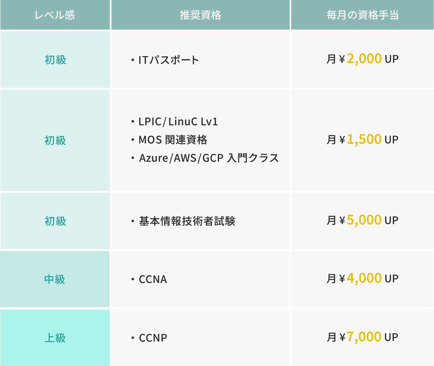 例えば、未経験からスタートしてCCNAと基本情報を取得すれば、月給が9,000円アップ。