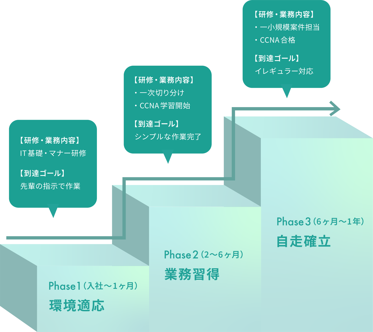 少しずつ実務の範囲を広げ、エンジニアとしての基礎体力をつけていく期間です。