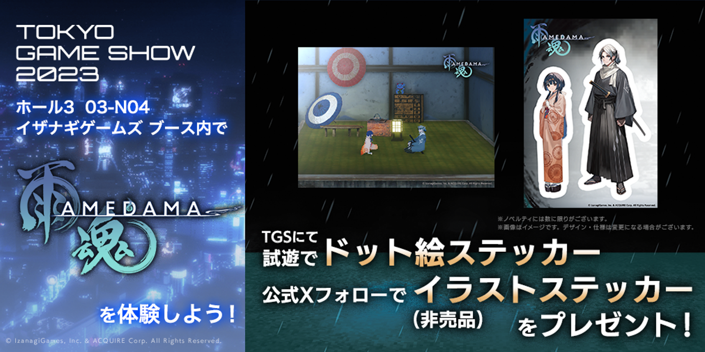 試遊してくれた方には、『雨魂 - AMEDAMA -』ドット絵ステッカー、公式Xアカウントをフォローしてくれた方には、『雨魂 - AMEDAMA -』イラストステッカーを配布予定!