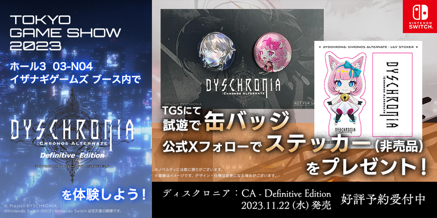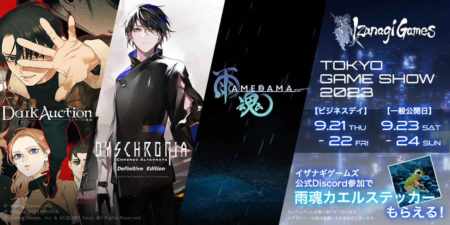 株式会社イザナギゲームズ(東京都江東区、プロデューサー兼CEO:梅田慎介)は、9月21日(木)~9月24日(日)の期間、幕張メッセで開催される「東京ゲームショウ2023」の出展内容を公開いたしました。本年発売予定の2作品、Nintendo Switch『DYSCHRONIA: Chronos Alternate - Definitive Edition』(ディスクロニア:CA ディフィニティブエディション)と『雨魂 - AMEDAMA -』を試遊タイトルとしてリアル出展し、開発中の新作『ダークオークション - ヒトラーの遺産 -』の最新PVや、等身大キャラクターパネルを展示予定。各ゲームの試遊や公式Xアカウントのフォロー、イザナギゲームズ公式Discordサーバーに参加でそれぞれオリジナル特製ノベルティをプレゼント!皆様のご来場をお待ちしております。
