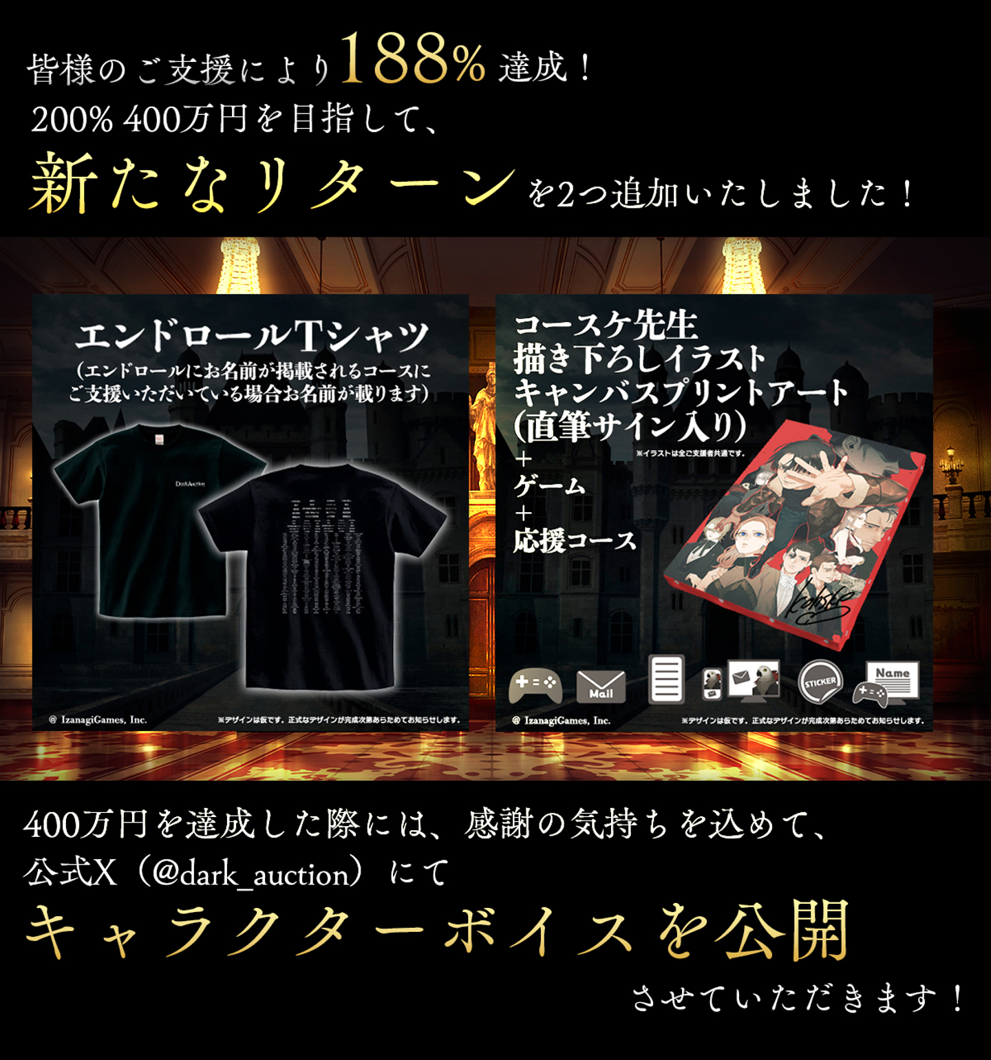 株式会社イザナギゲームズ(東京都江東区、プロデューサー兼CEO:梅⽥慎介)は、9月2日より実施している新作ゲーム『ダークオークション - ヒトラーの遺産 -』のクラウドファンディングが、皆様のご支援により目標金額200万円を達成したことをご報告いたします。目標達成に伴い、ネクストゴール(目標金額:400万円、達成率200%)と新たなリターン「エンドロールTシャツ」「コースケ先生描き下ろしイラストキャンバスプリントアート(直筆サイン入り)」(※)の追加を発表いたしました。ネクストゴールを達成した際には、公式Xにてキャラクターボイスを公開いたします。ご支援、よろしくお願いいたします!