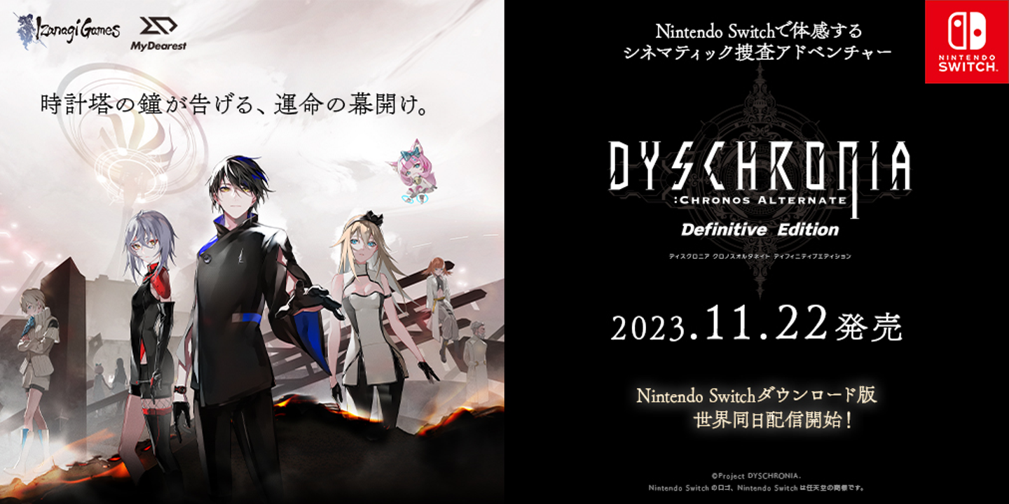 株式会社イザナギゲームズ(東京都江東区、プロデューサー兼CEO:梅田慎介)は、MyDearest株式会社(東京都中央区、代表取締役CEO:岸上健人)と共同で開発している、Nintendo Switch『DYSCHRONIA: Chronos Alternate - Definitive Edition』(ディスクロニア:CA ディフィニティブエディション)のダウンロード版の世界同時発売を発表いたしました。北米・欧州・アジア地域の配信開始は日本と同日の2023年11月22日となります。