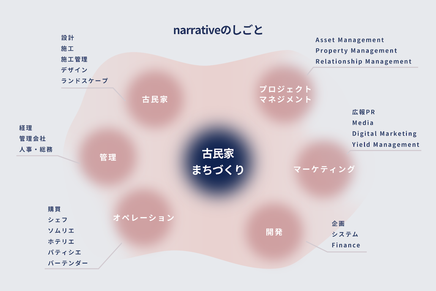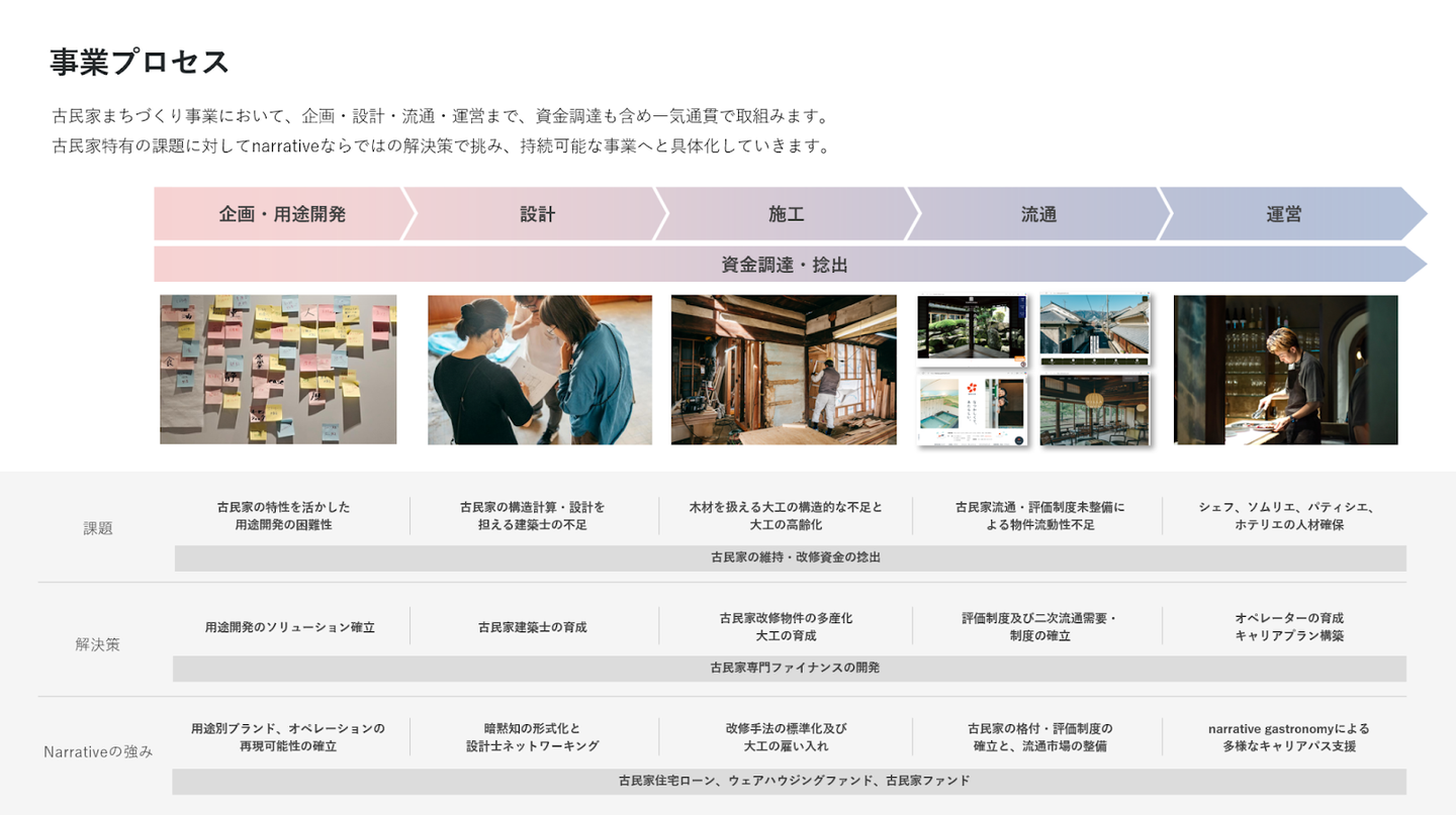 当社は、古民家の「企画・開発」を嚆矢(事業のはじまり)としつつ、多数のプロジェクトを通じて、設計、施設運営、資金調達など、古民家まちづくりに於けるバリューチェーンの多様化を図ってきました。施設運営においては、宿泊施設をはじめ、飲食施設、銭湯・サウナ、コワーキング施設及び住居など、古民家再生における多様な用途開発を行ってきました。