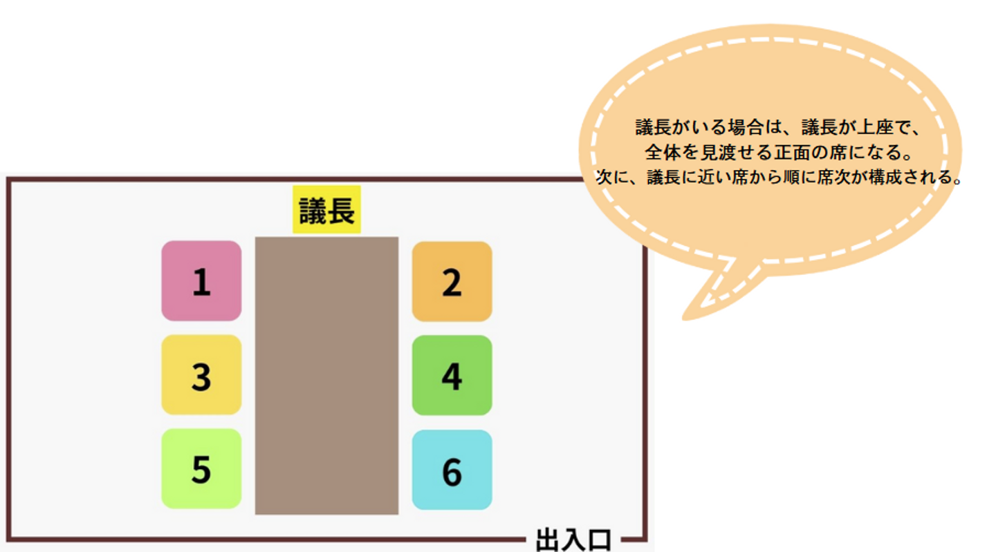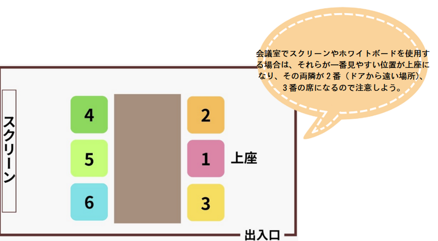 上座に座る順番は、基本的には出入口から遠い席からとなります。役職が最も高い人、