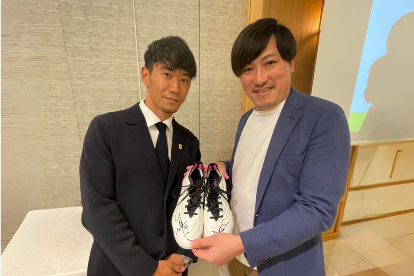 また、年に1回の報告会では、所属している日本人選手と触れ合う機会もあります。海外で活躍している選手と直接コミュニケーションが取れるのは貴重な体験です。名刺交換もしますし、出会いをきっかけに会社に興味を持ってもらえるといいですね。イベントでは、当時シント=トロイデンに在籍していた香川真司選手のスパイクが当たるという幸運にも恵まれました(笑)。