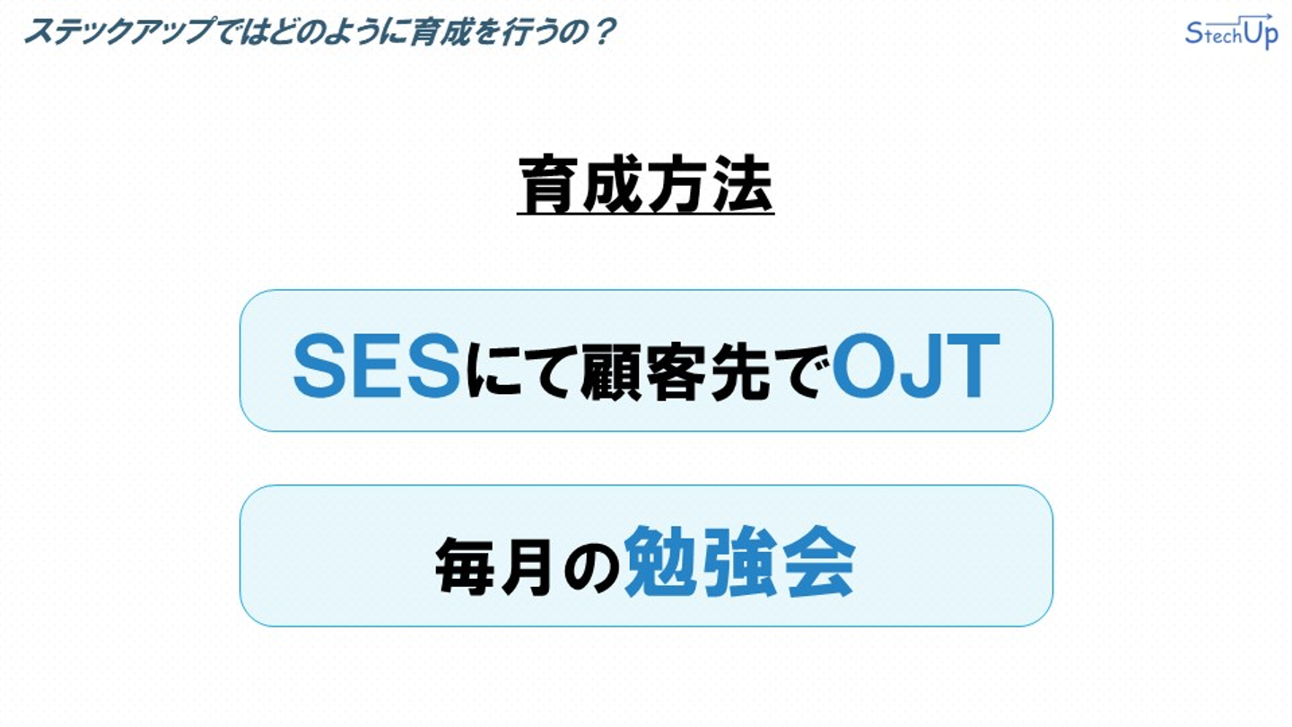 具体的な育成方法はこちらの2つを軸に行っています。まずは、SESにて顧客先でOJTを行います。先ほど説明したメンターとトレーニーのチーム体制で、顧客先で実際に働きながら実践教育を行います。育成方法のもうひとつは毎月の勉強会です。勉強会では、ITとお金の分野を軸にした勉強会を開催します。ステックアップではこれらの育成方法により、ITとお金に強いエンジニアに育て上げます。
