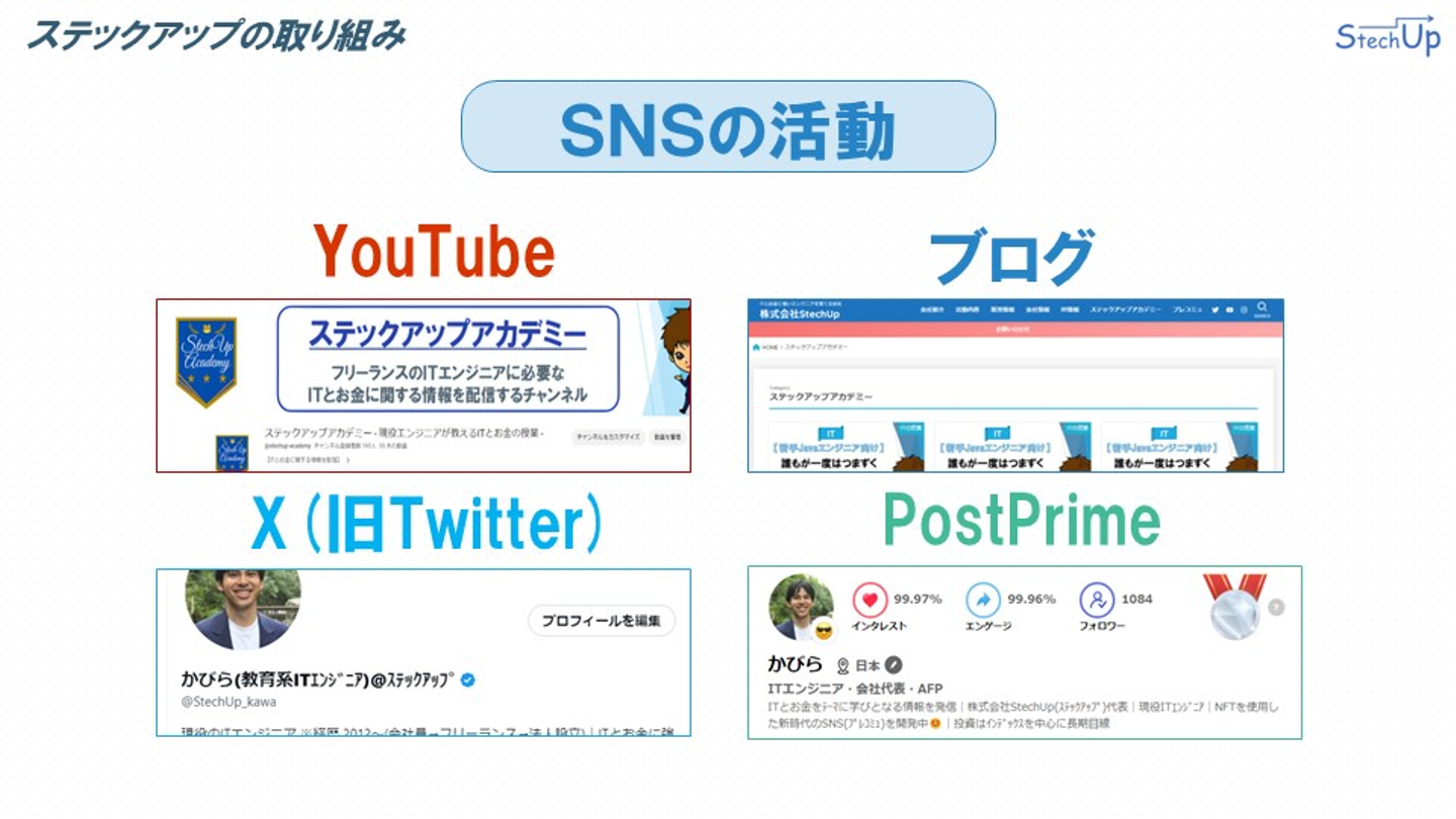 ステックアップではSNSの活動も積極的に行っています。YouTubeとブログでは、ITとお金に関する情報を発信する「ステップアップアカデミー」を運営しており、旧TwitterであるXや、PostPrimeでは、私の日々のつぶやきや、毎日関心のあるトピックの考察記事を投稿してます。これらもフォローしていただけたら大変嬉しいです。