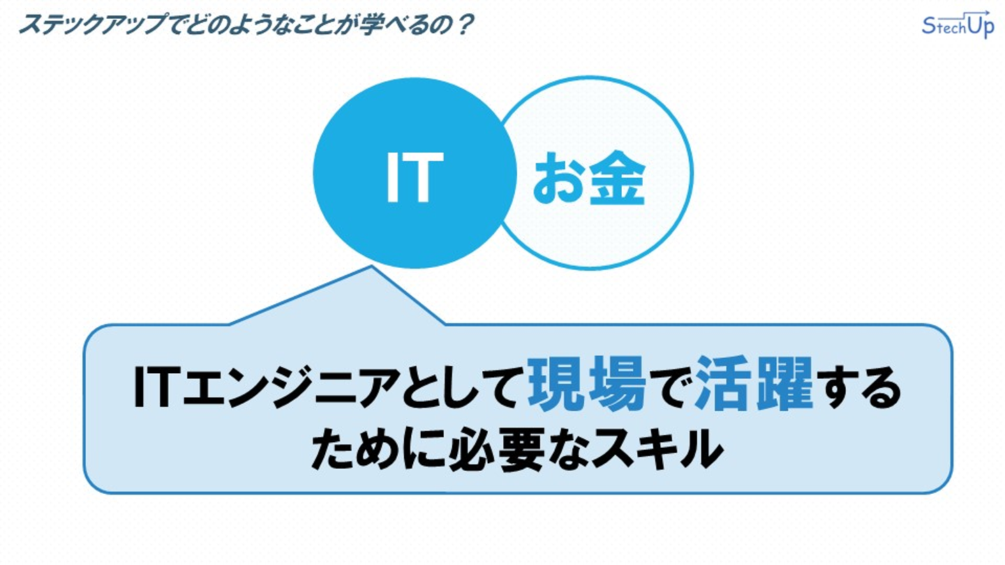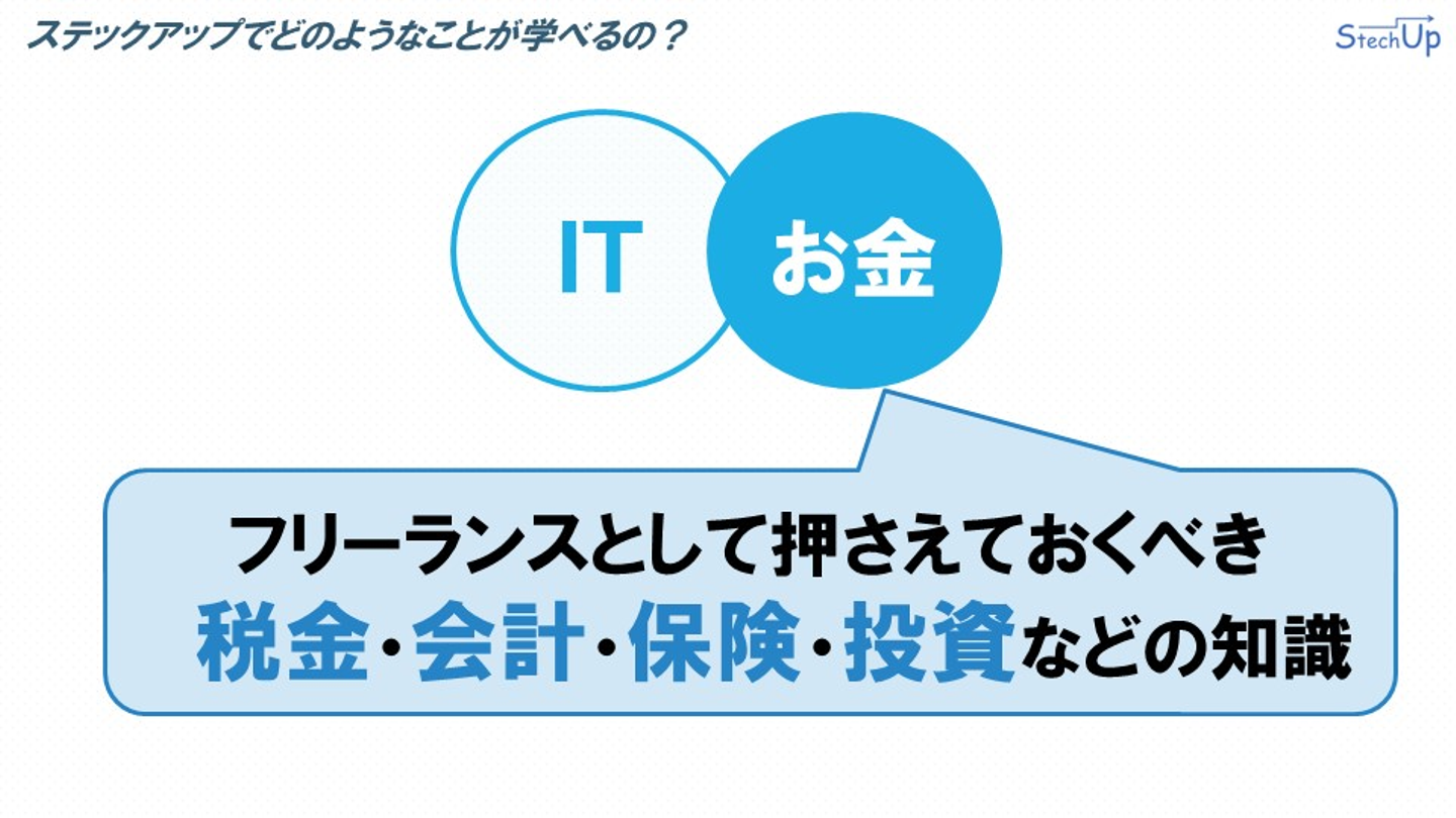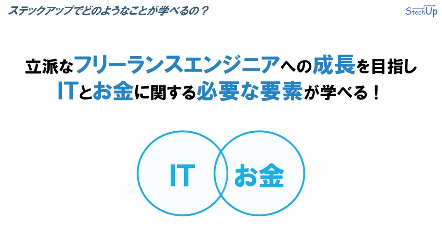 ステックアップでどのようなことが学べるのか説明します。ステックアップでは、立派なフリーランスのITエンジニアへの成長を目指し、フリーランスのITエンジニアに必要なITとお金の関する要素を学ぶことができます。