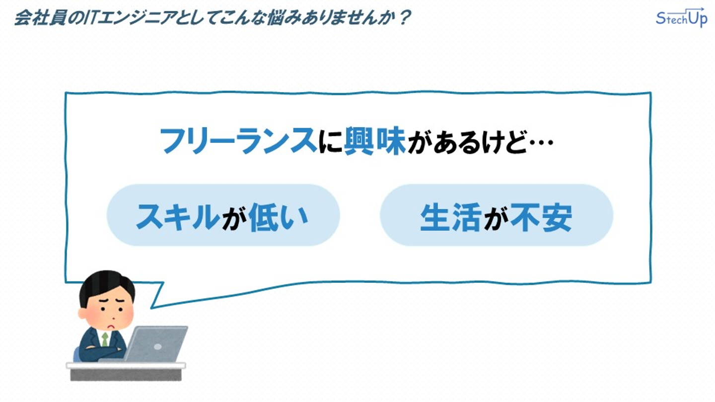 ステックアップは、そのようなフリーランスになりたいけど不安を抱えているITエンジニアの悩みを解決するために設立した会社です。