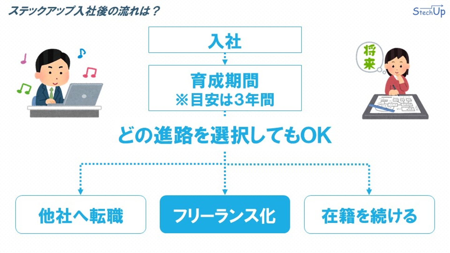 まず、ステックアップに入社していただいたのちに、育成期間に入ります。育成期間は、人それぞれですが、目安は3年間としています。育成期間が終了したのちに、フリーランス化していただきます。フリーランス化にあたっては、そのとき携わっているプロジェクトをそのまま契約移行させますので、ITエンジニアにとっては比較的スムーズにフリーランスに転身することが可能となっています。