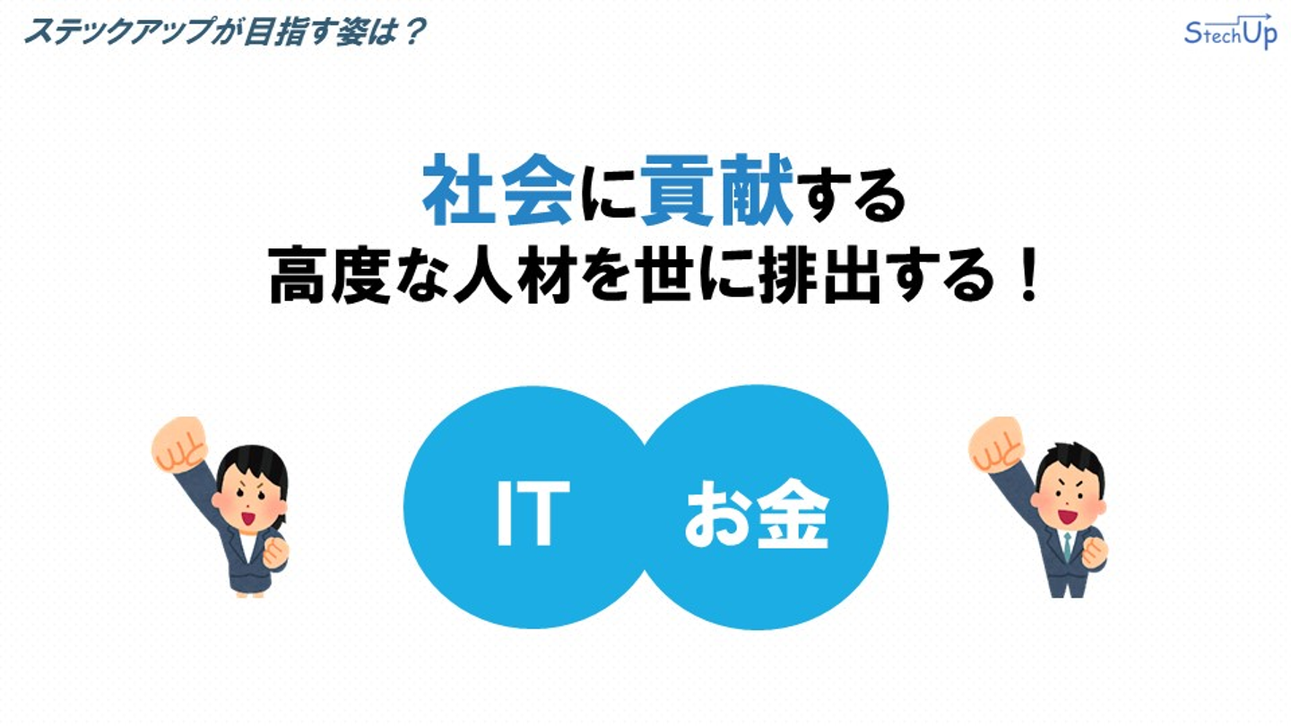 ステックアップは、このようにITとお金に強いエンジニアに育て上げることで、IT関連事業で社会に貢献する高度な人材を世に排出します。