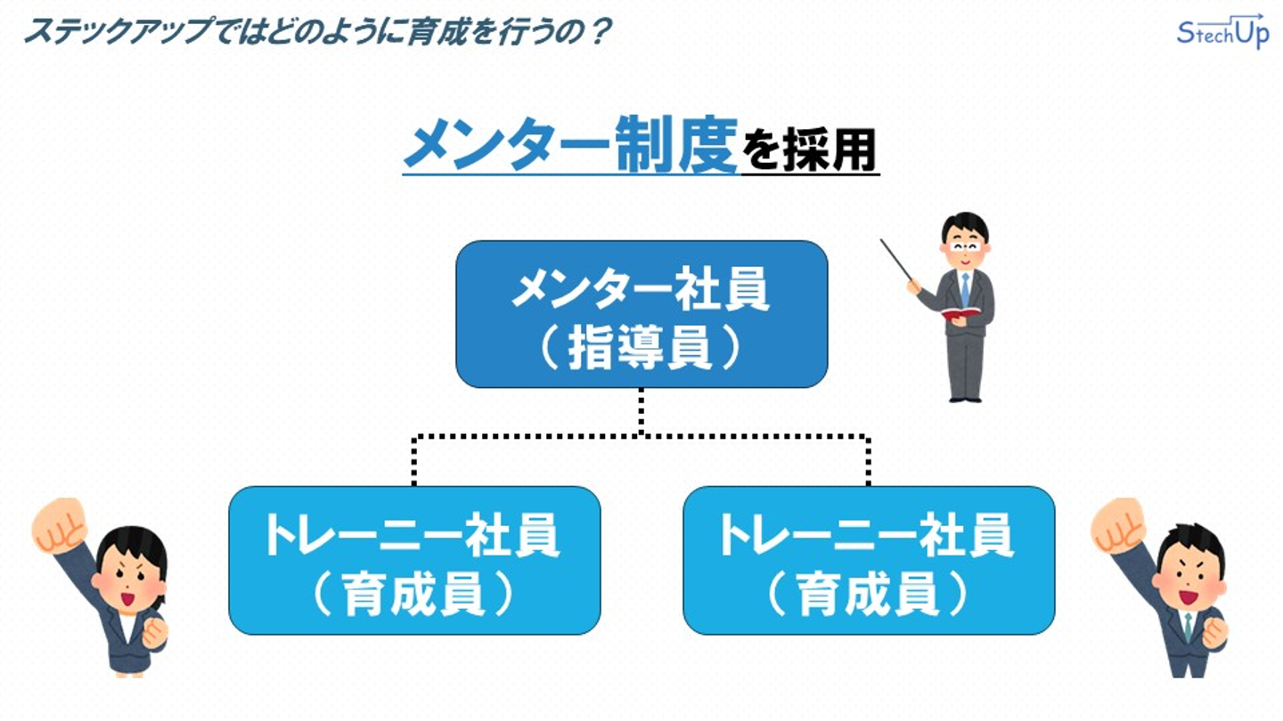 次にステックアップの育成方法について説明します。ステックアップではメンター制度を採用しています。指導員としてのメンター社員がおり、その配下に育成員であるトレーニー社員が配置されます。
